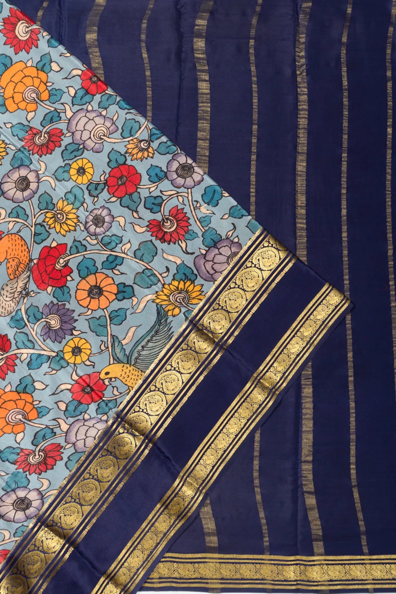 Binny Silk Kalamkari Hand Painted Pastel Blue Saree