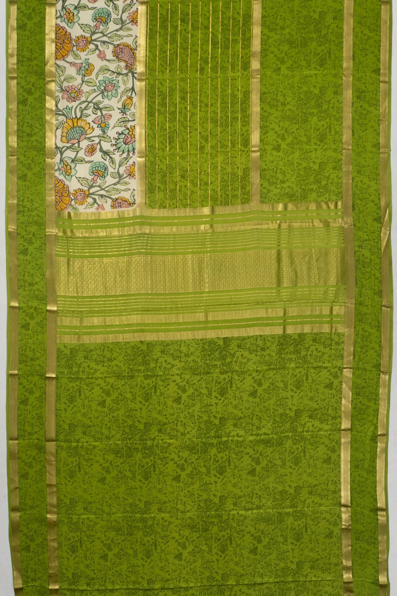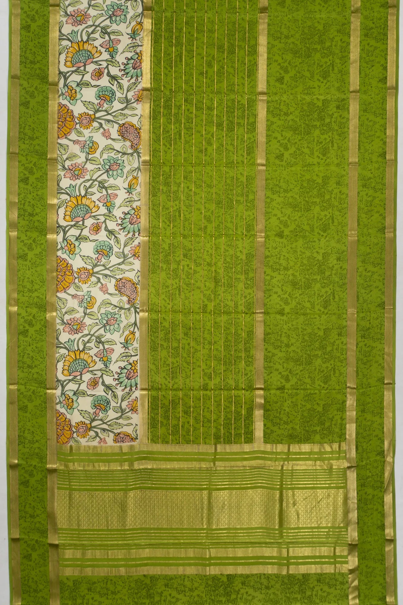 Embrace the grace of tradition with our Binny Silk Lines and Printed Green Saree, a testament to the rich heritage of saree craftsmanship The saree's body is adorned with gold zari horizontal lines and delicate floral prints on a white base, exuding an aura of refined elegance