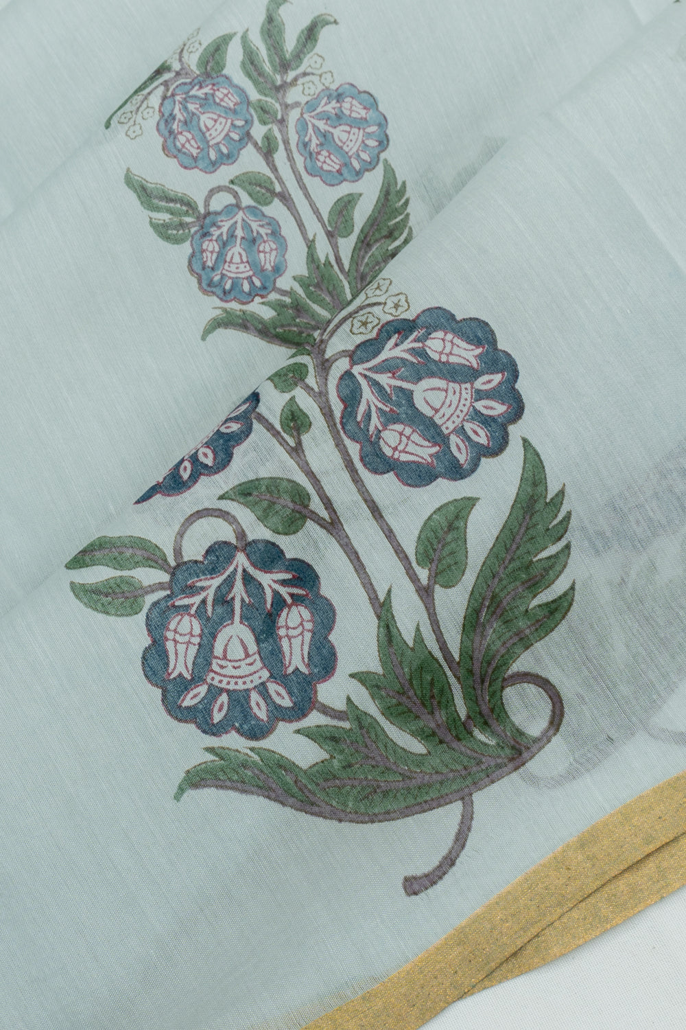 Body: Adorned with delicate Floral Block Printed butta, this pastel green Chanderi Cotton saree exudes a soft and elegant charm.