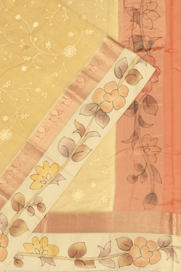 Chanderi Cotton Embroidery Jaal Yellow Saree With Handpainted Border