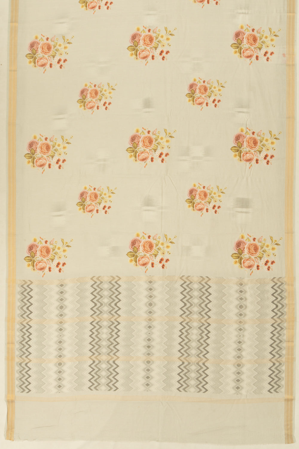 The self gold zari zig-zag lines small border adds a hint of glamour, complementing the self floral printed pallu with