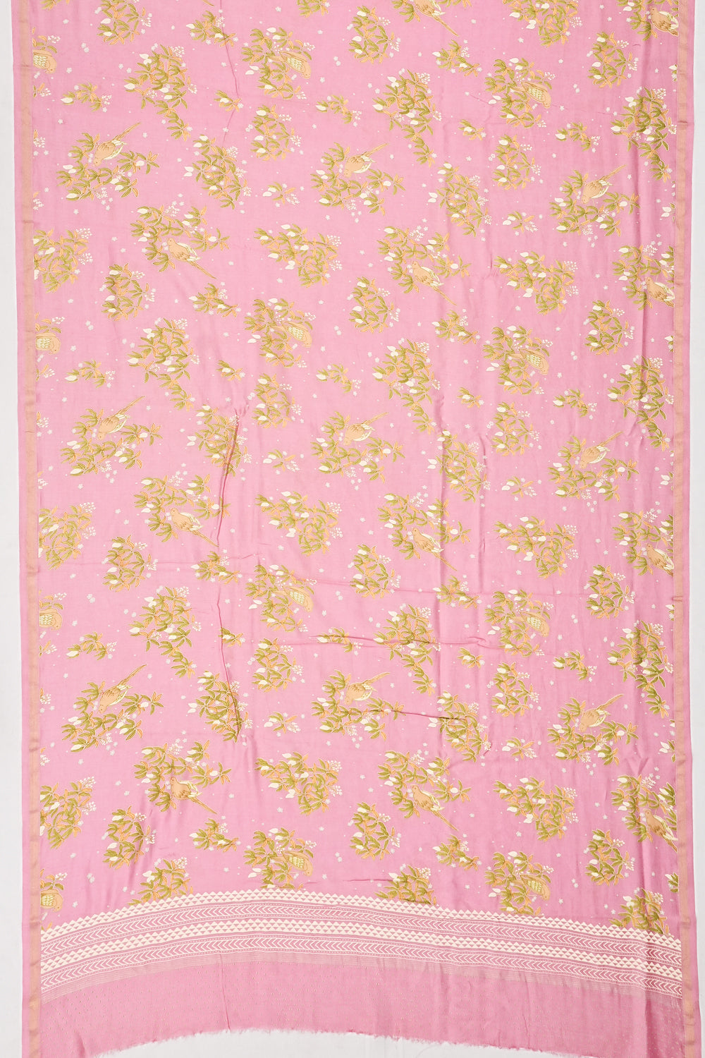 Body: Floral and bird prints all over the saree. The pink tone combined with intricate motifs brings a lively aesthetic