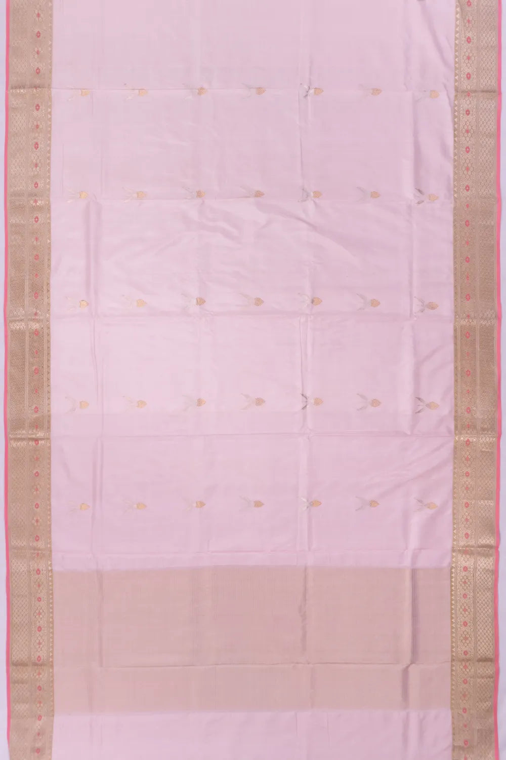 Body: Soft baby pink base with shimmering gold and silver zari floral buttas that lend a graceful charm.