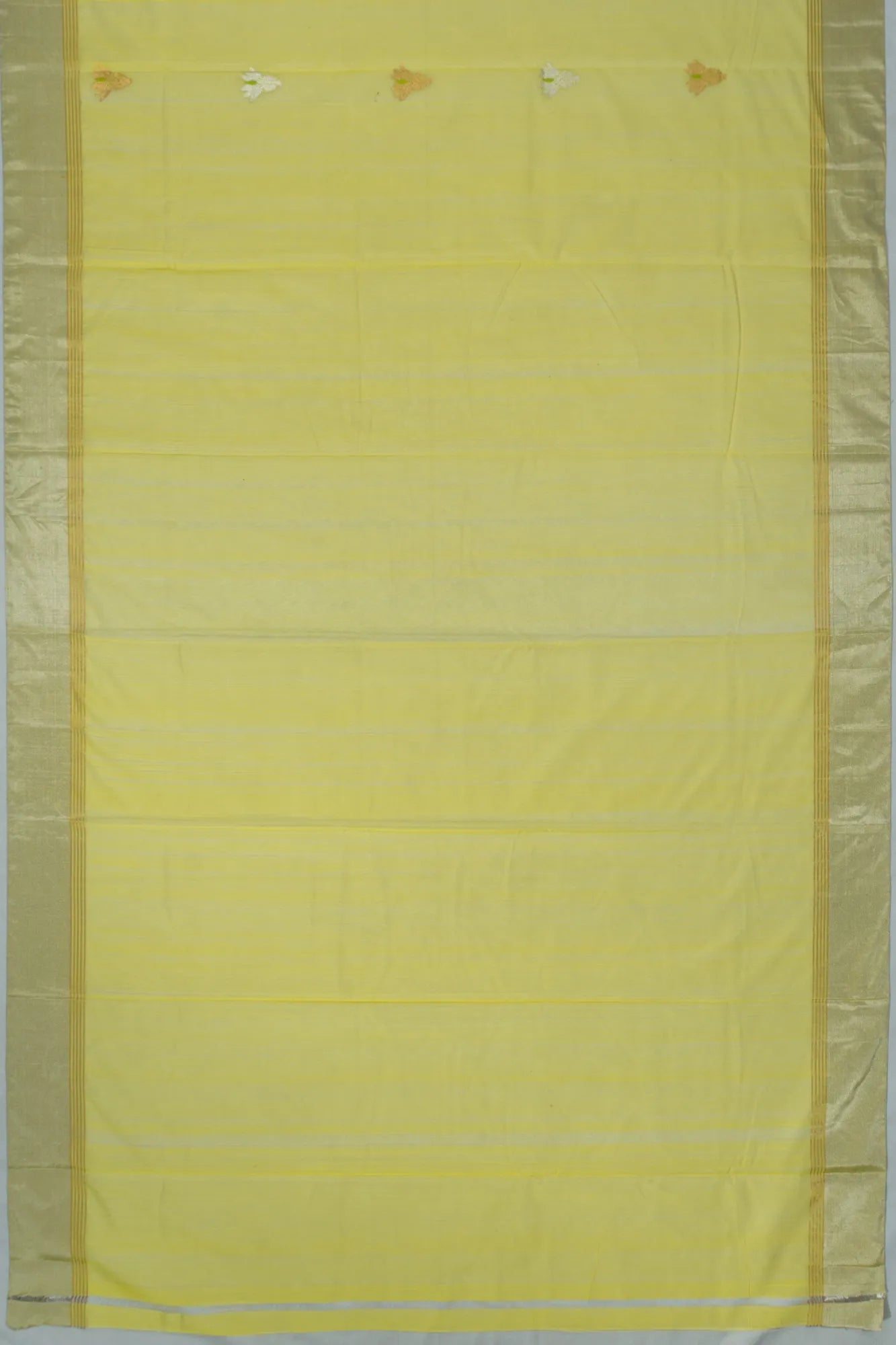 Complementing the vibrant lemon yellow, the saree features a self silver zari kaddi border, accentuated with gold zari horizontal lines