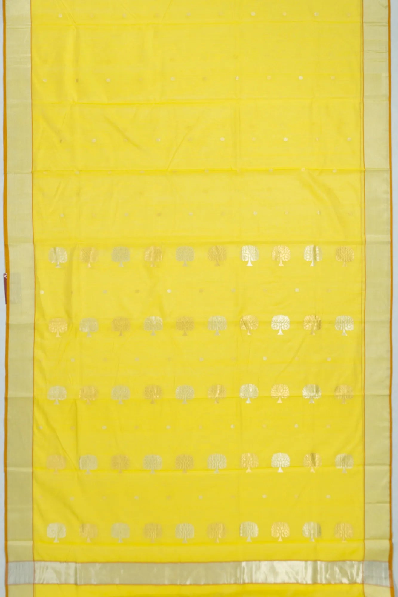 A contrast mustard yellow border, detailed with gold zari kaddi, enhances the sarees graceful appeal