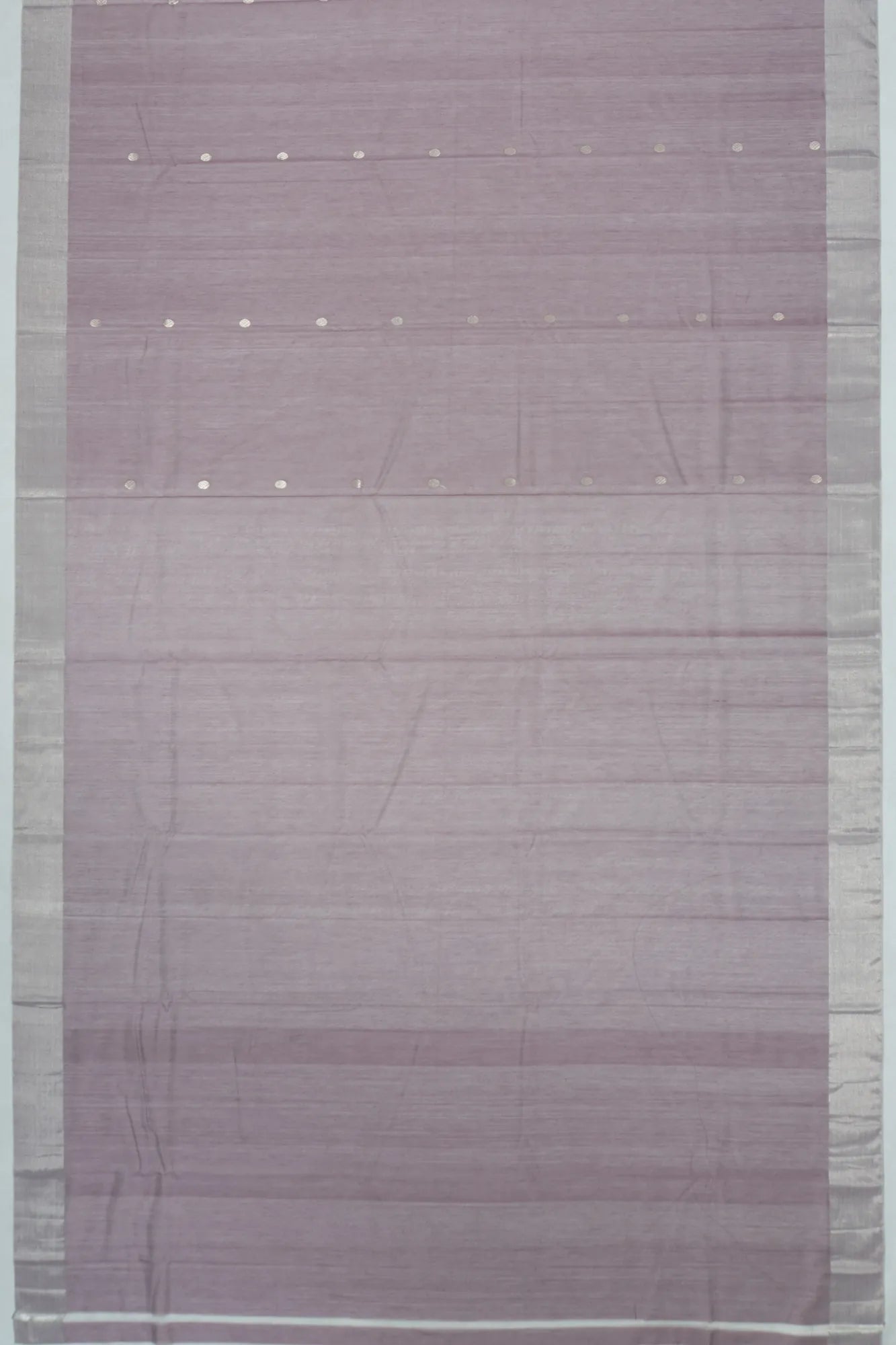The sarees body is adorned with delicate silver zari floral buttas, offering a graceful touch that exudes timeless elegance