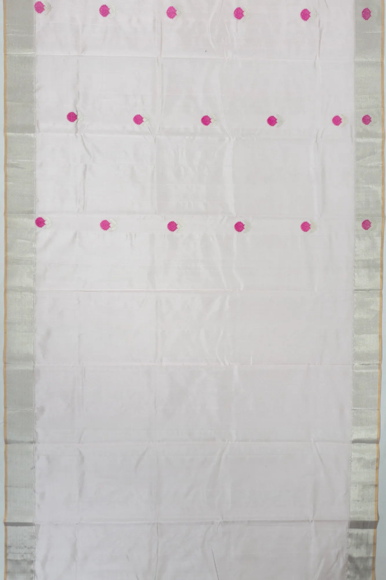 This saree features a self silver zari kaddi small border, adorned with floral buttas and accented by a graceful gold edge