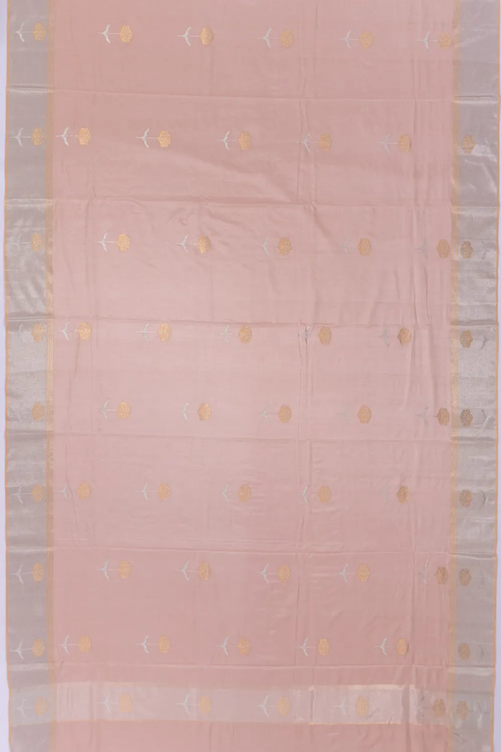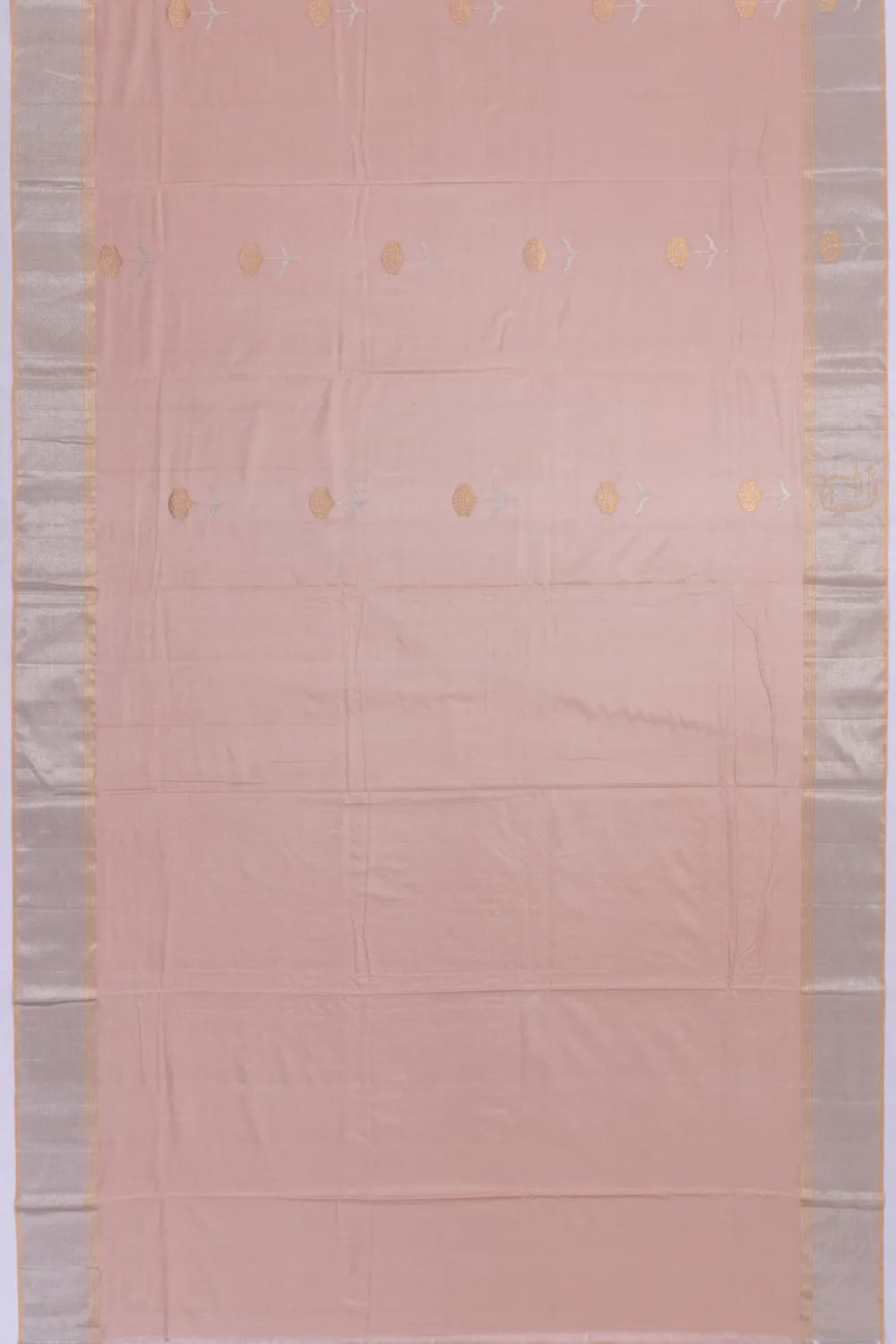 Subtle peach base featuring elegant gold and silver zari floral buttas that radiate understated sophistication.