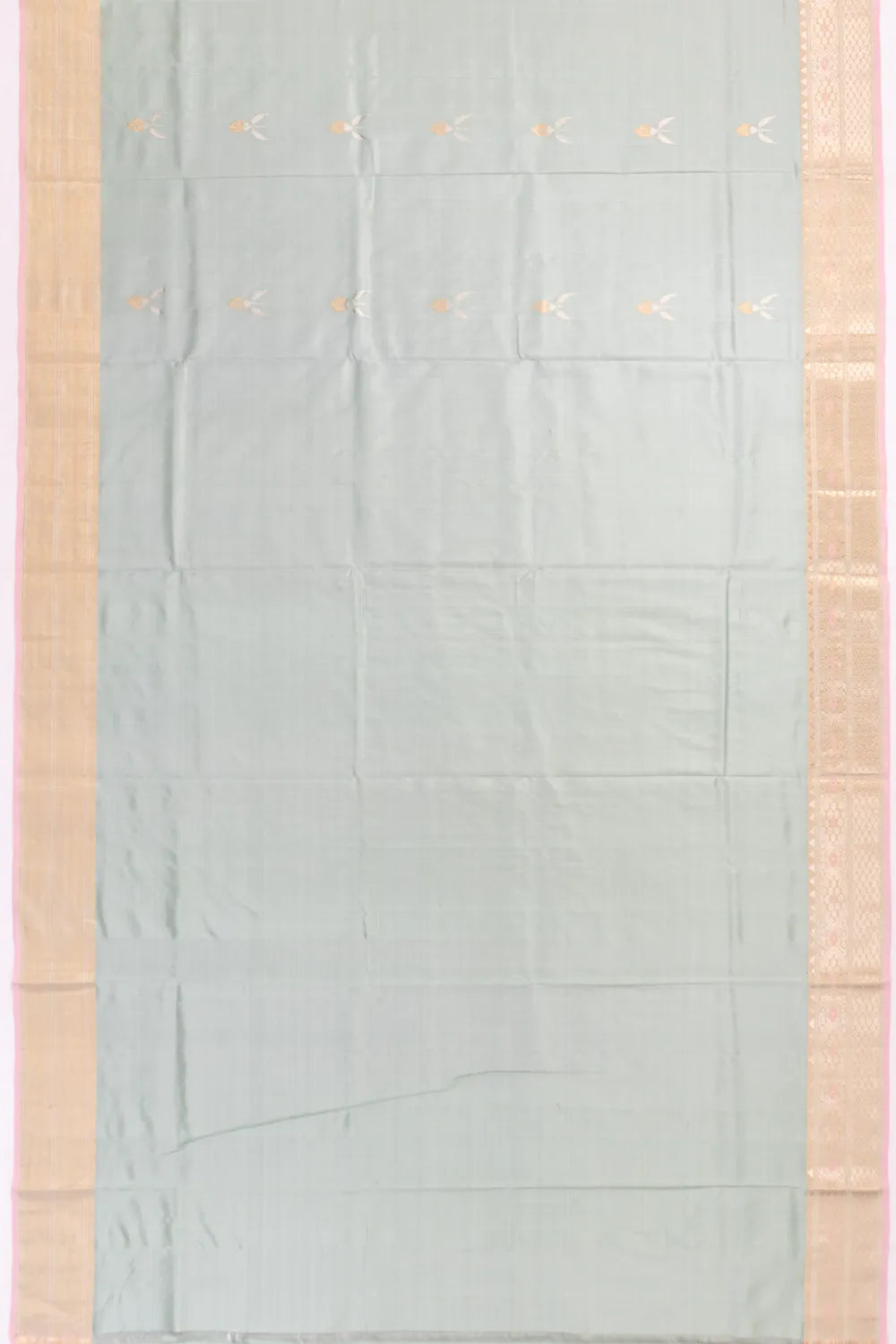 Body: Soft sage green body adorned with delicate gold and silver zari floral buttas that add a subtle shimmer.