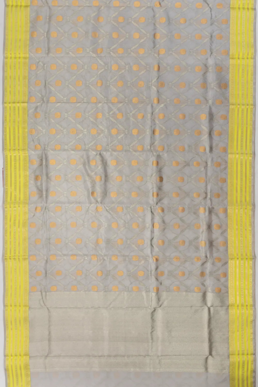 Elegant grey base featuring a rich all-over floral jaal in shimmering gold and silver zari, offering a refined, timeless charm.