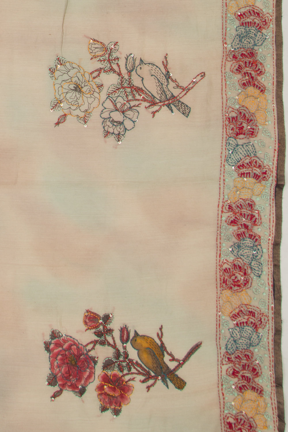 Chanderi Silk Printed And Kantha Work Beige Saree