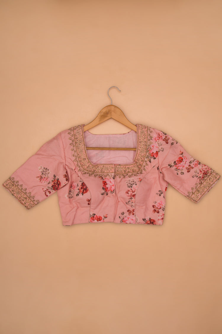 The kardhana embroidery neckline, adorned with intricate zardozi spring and sequence work, sets the tone for sophistication The sleeves feature delicate kardhana embroidery with zardosi spring and sequence detailing, creating a stunning visual appeal The body showcases a beautiful floral print, adding a touch of charm to the overall design This blouse is a perfect blend of traditional artistry and contemporary style, providing a stylish and comfortable fit for any special occasion Elevate your ensemble with this exquisite Chanderi Silk creation
