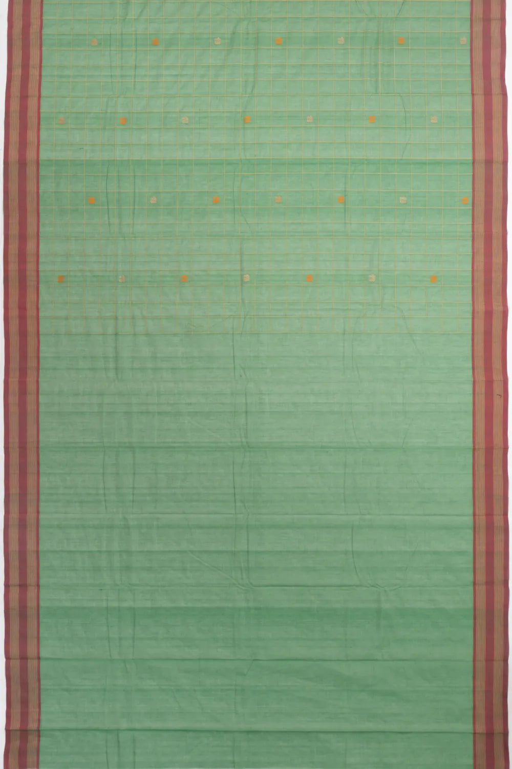 A soothing green base with subtle cream checks is intricately enhanced with cream and yellow threaded peacock buttas, creating a fusion of grace and vibrance.