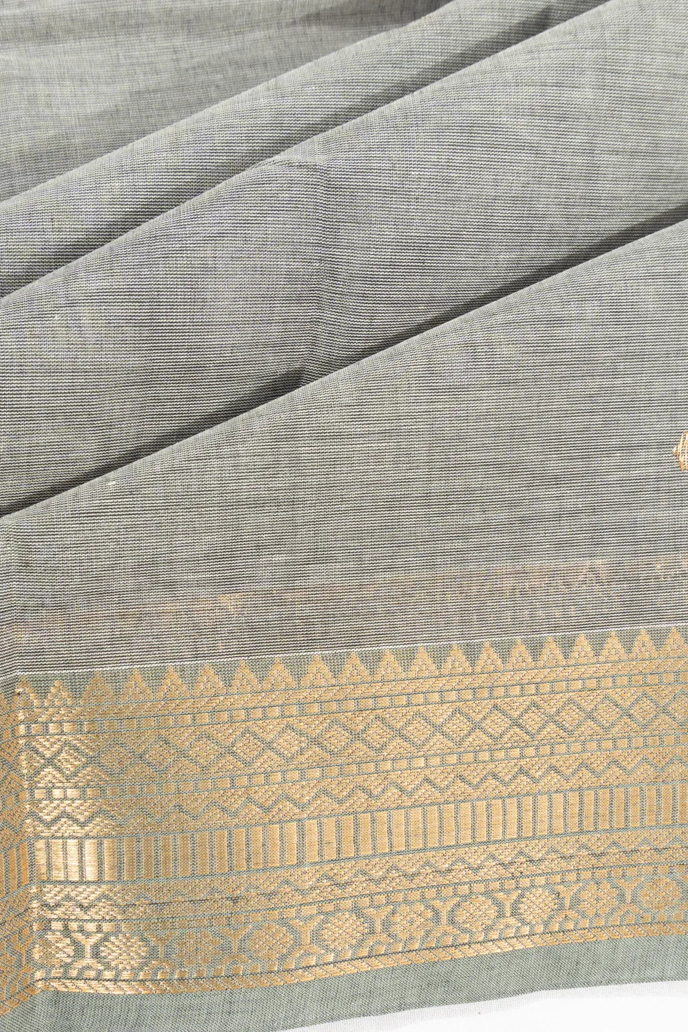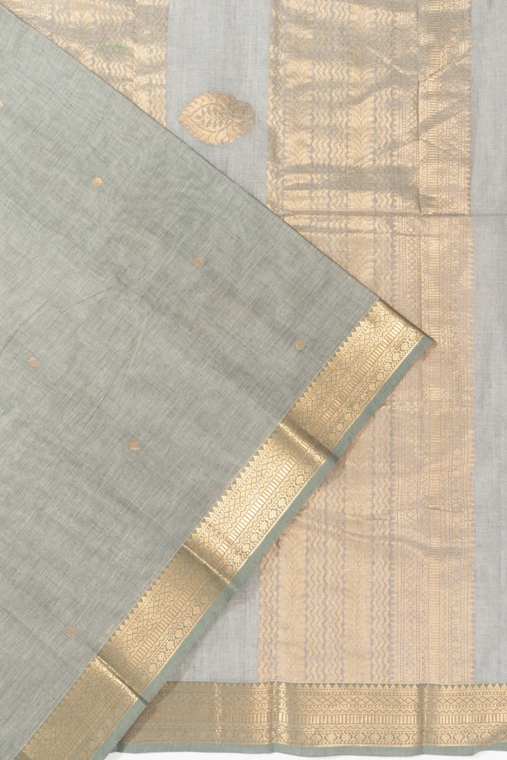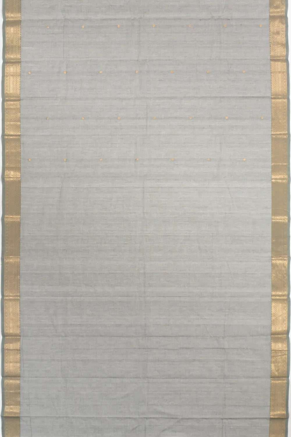 A soft pastel grey base is delicately embellished with scattered gold zari floral buttas, giving it a subtle richness and elegant charm.