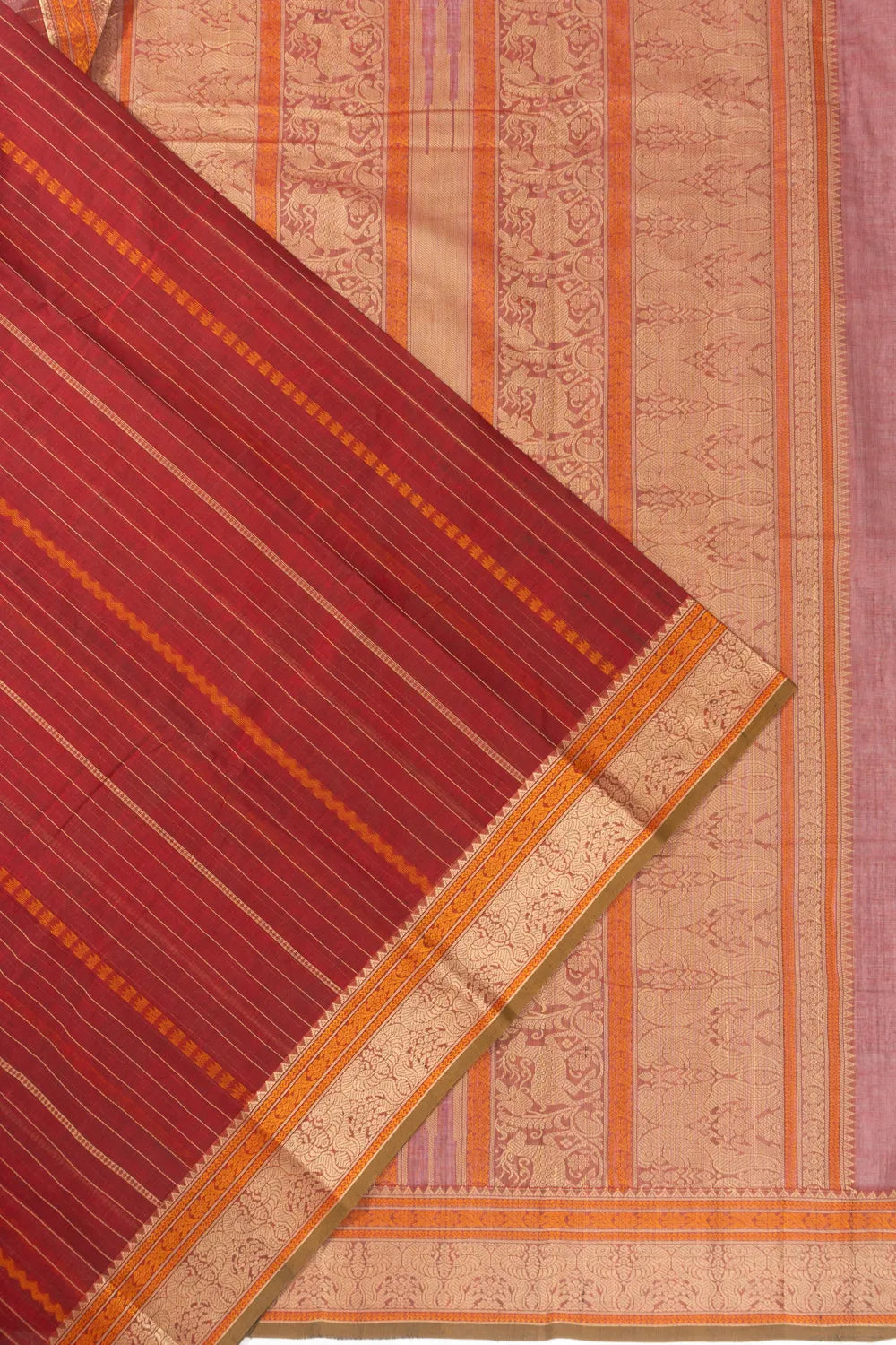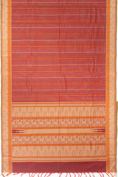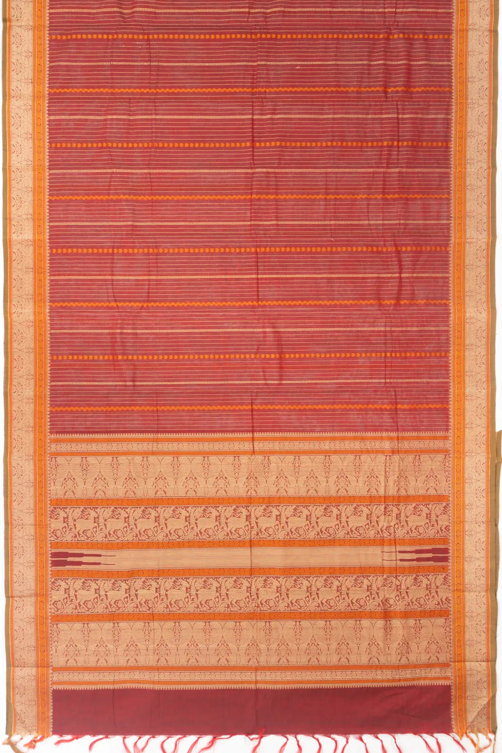 The self pallu features a fine blend of cream threaded deer and peacock motifs in a floral arrangement, complete with tassels for a traditional finish.