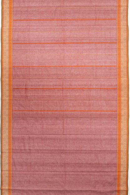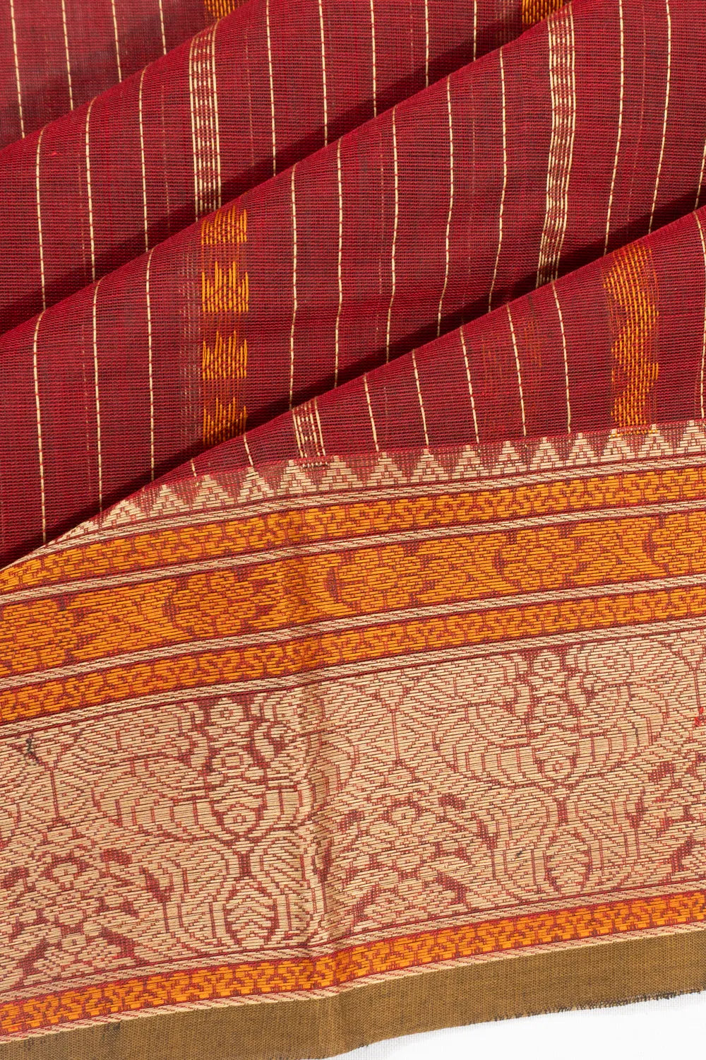 A self small border woven with yellow threaded floral brocade is further detailed with cream threaded peacock motifs, finished with a graceful green edge.