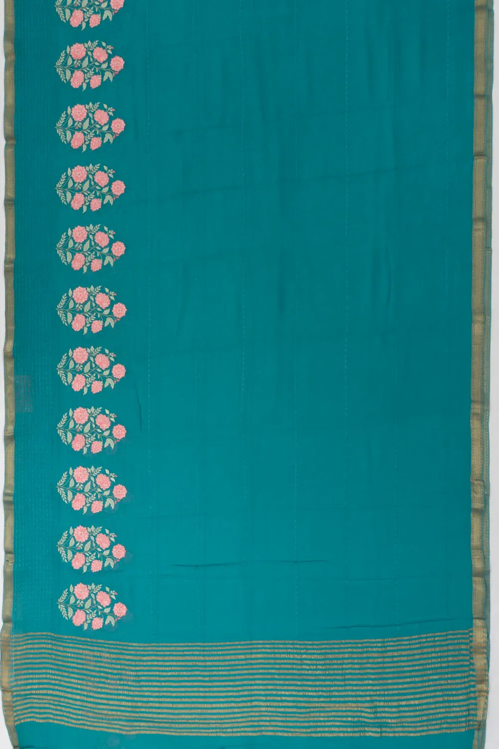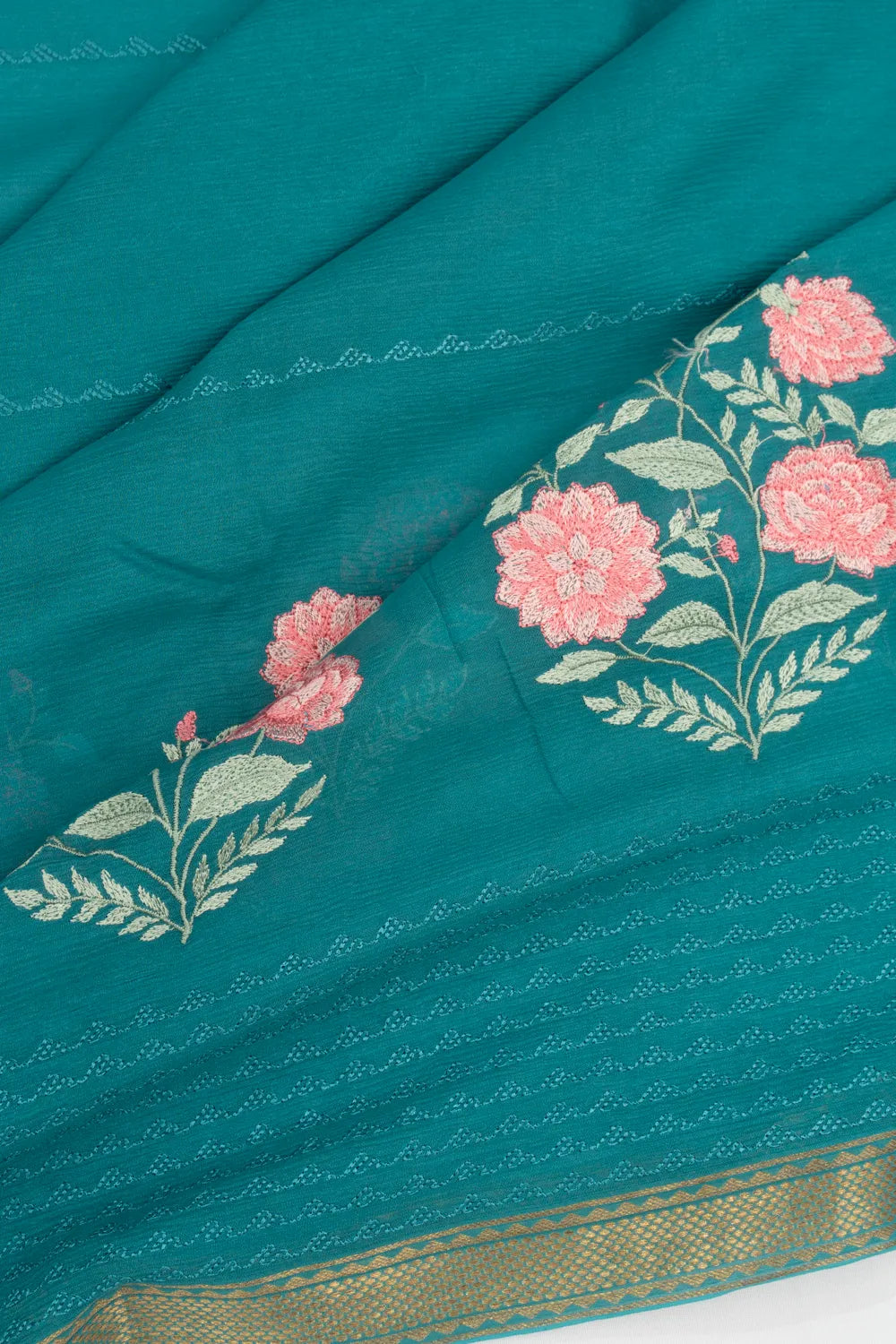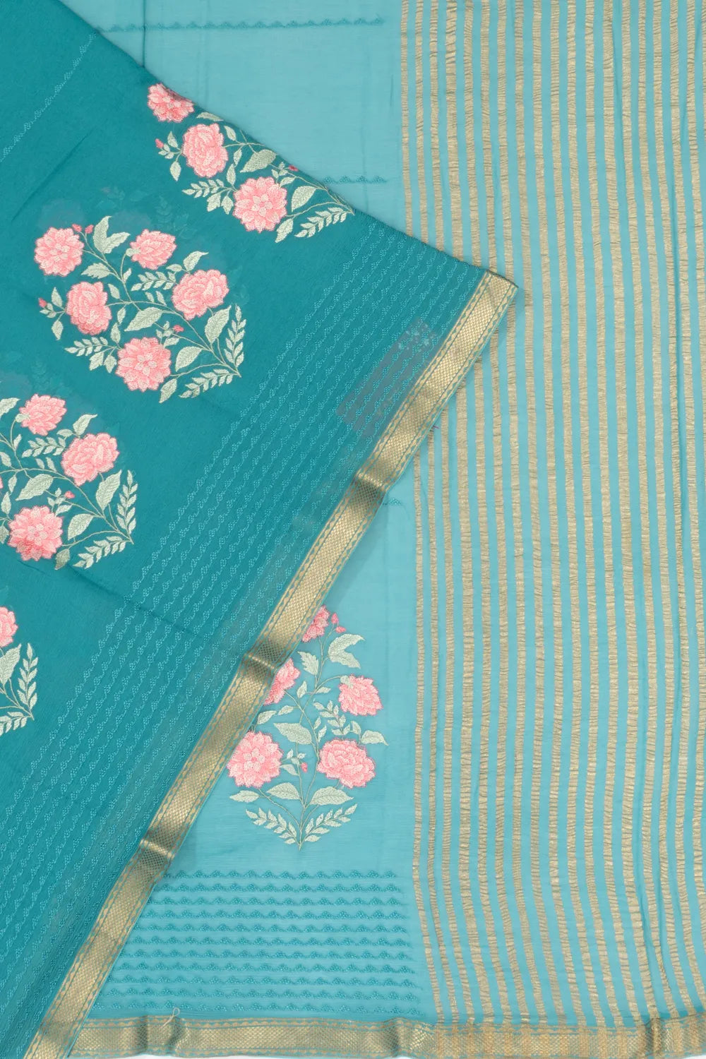 Designed with intricate embroidery horizontal lines and floral embroidery on its pleats, this saree brings an aura of refined sophistication in a soothing blue shade.