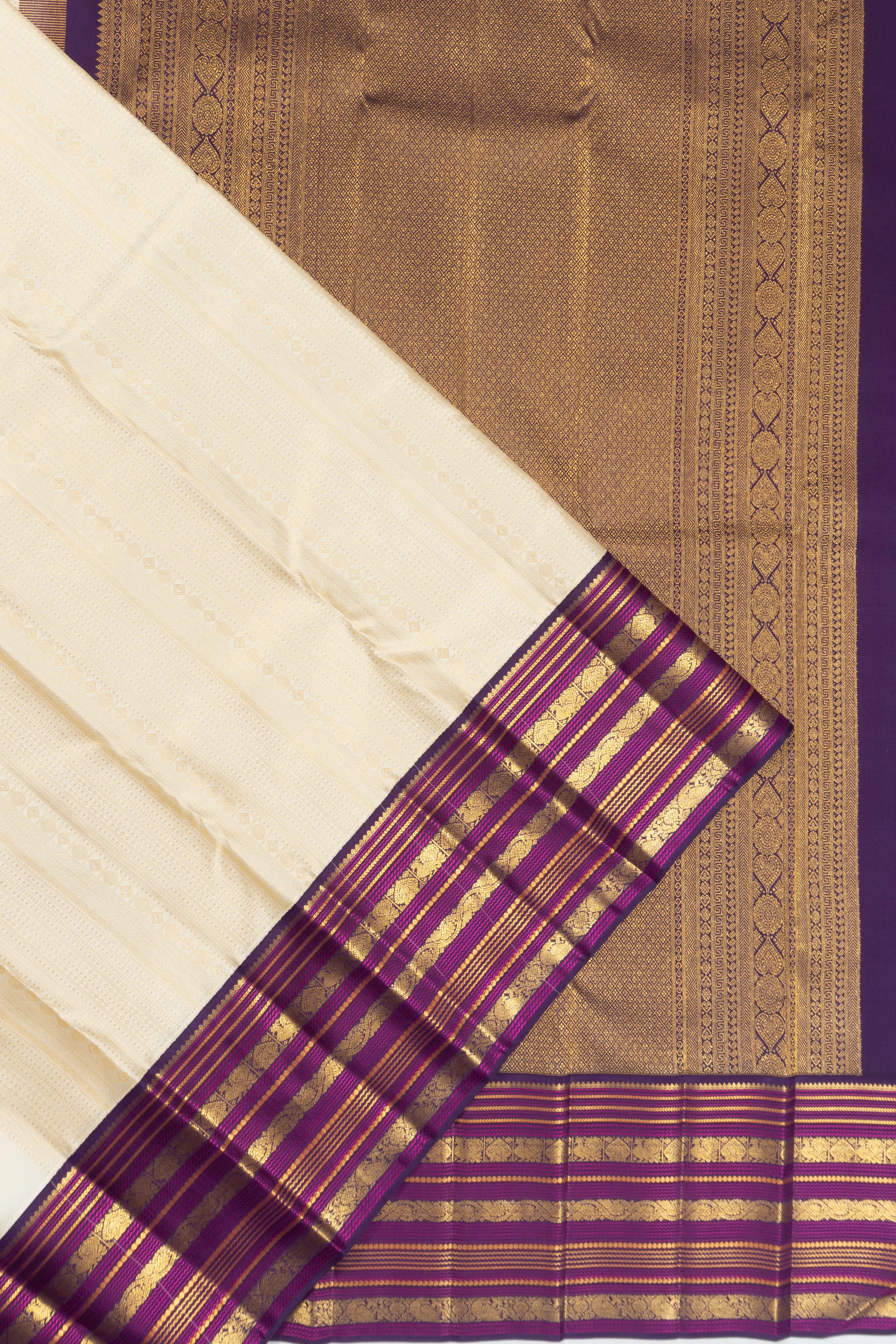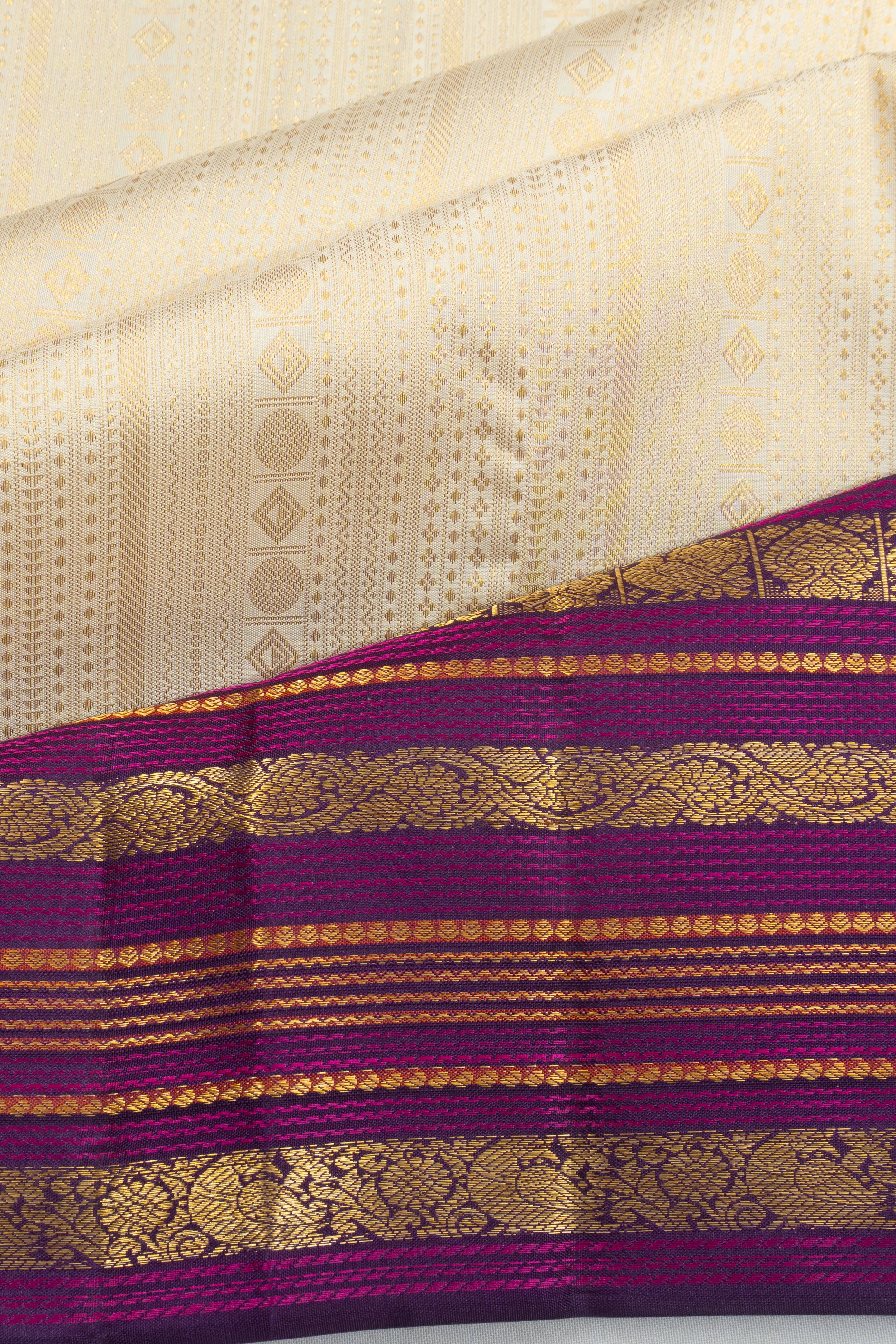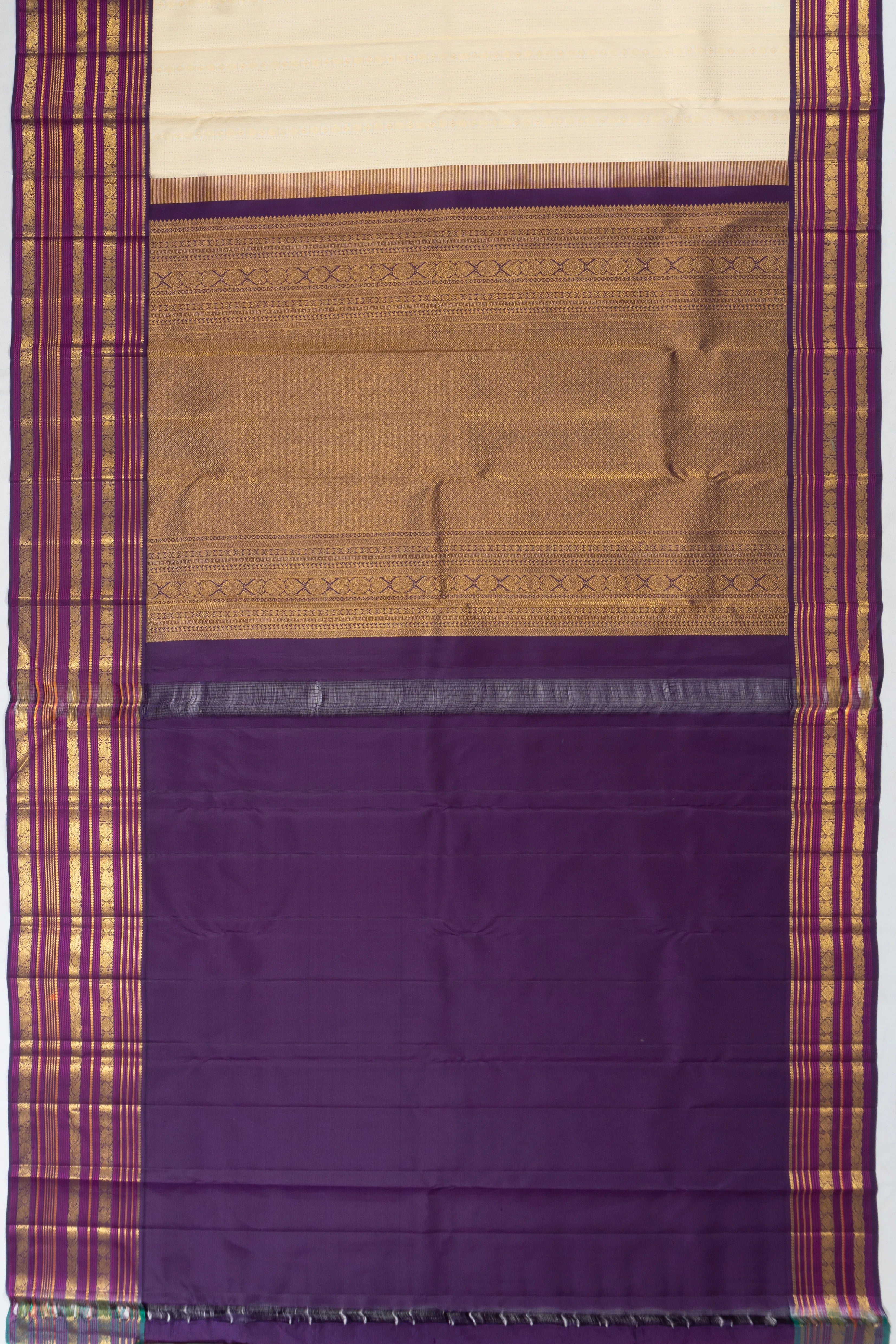 A subtle yet striking contrast is introduced with a violet border, adorned with intricate gold zari peacock and floral motifs, creating a harmonious blend of color and design