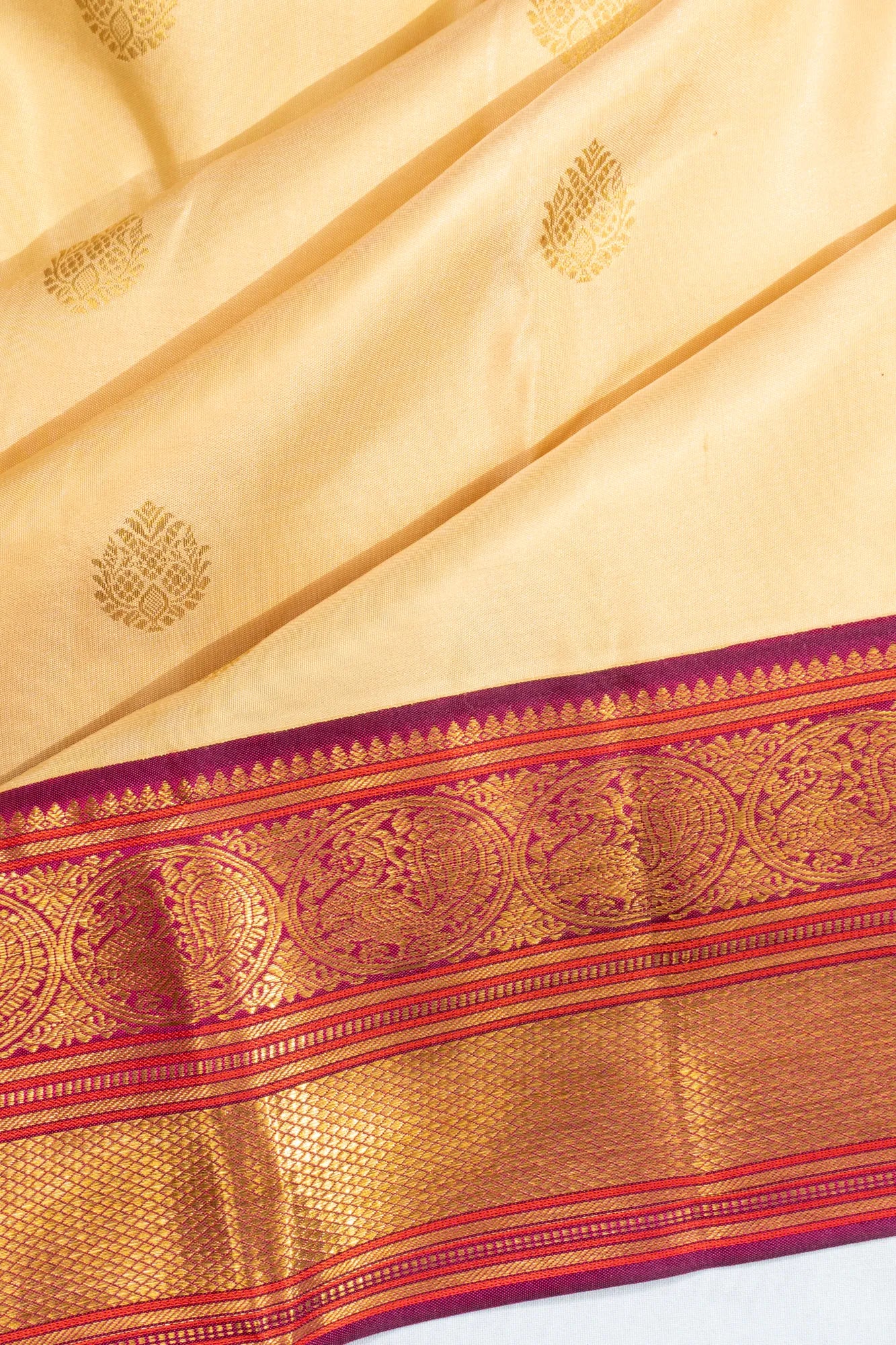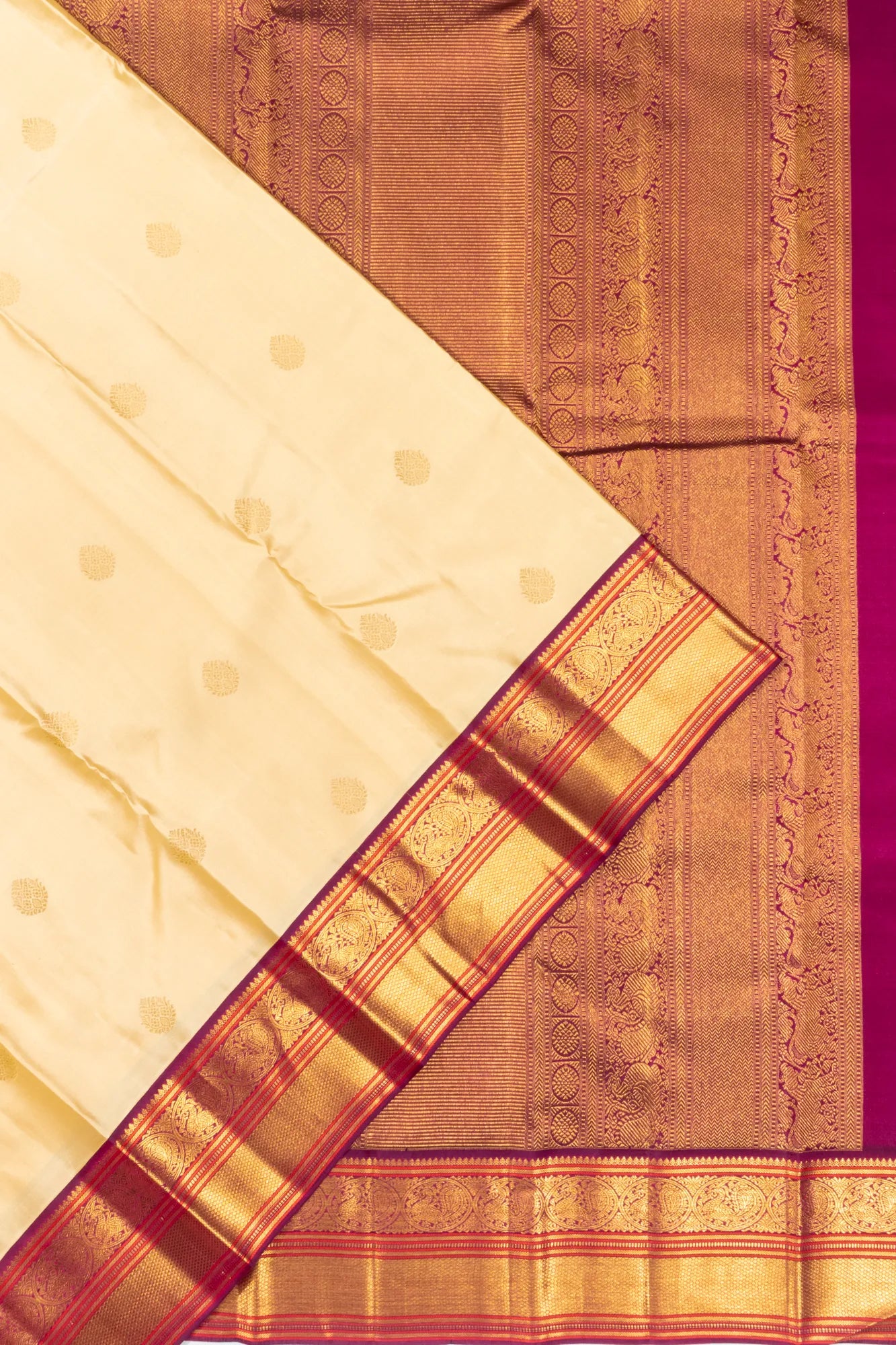 This elegant cream Classic Kanchipuram silk saree showcases gold zari floral buttas woven in traditional finesse, offering a soft and graceful aesthetic ideal for formal and festive occasions.