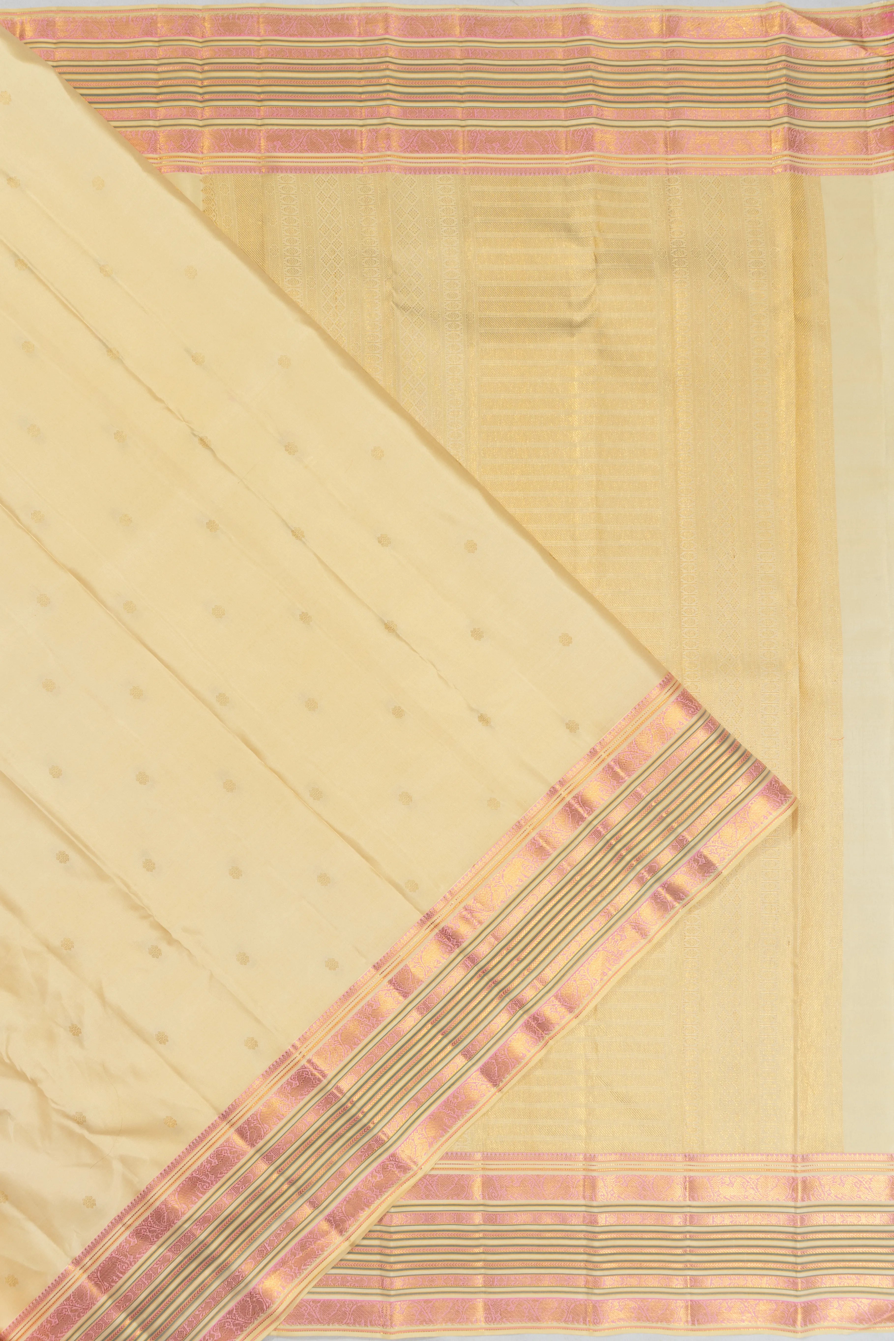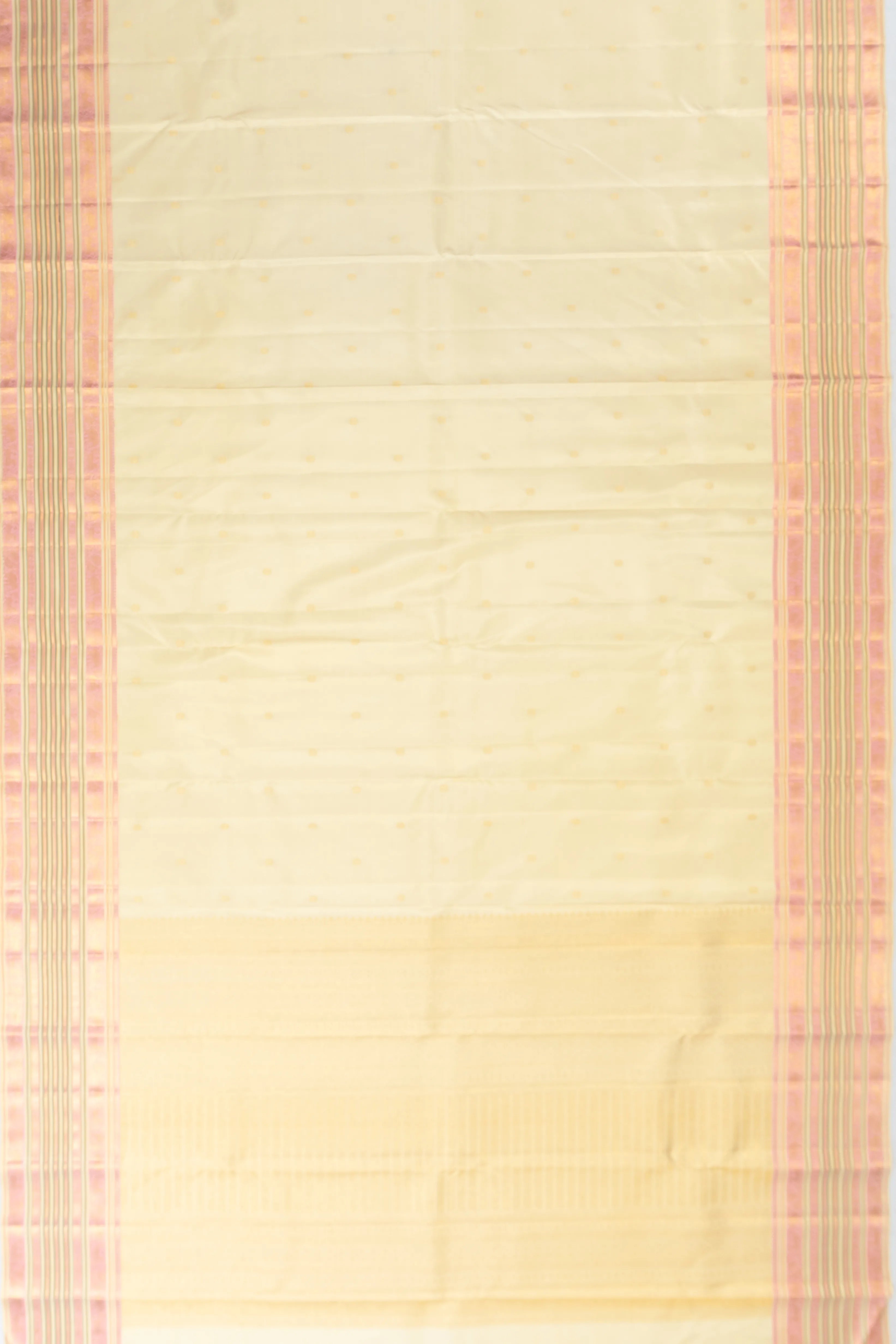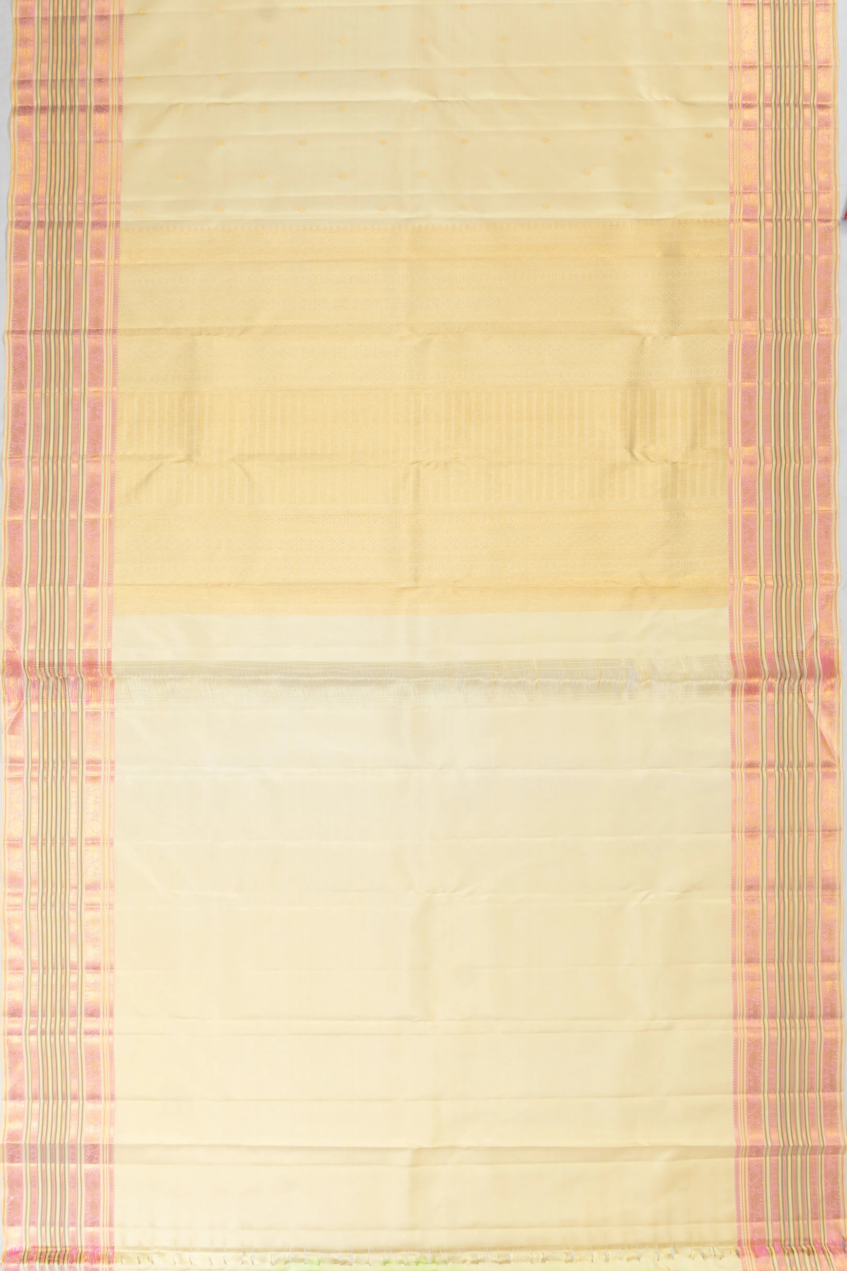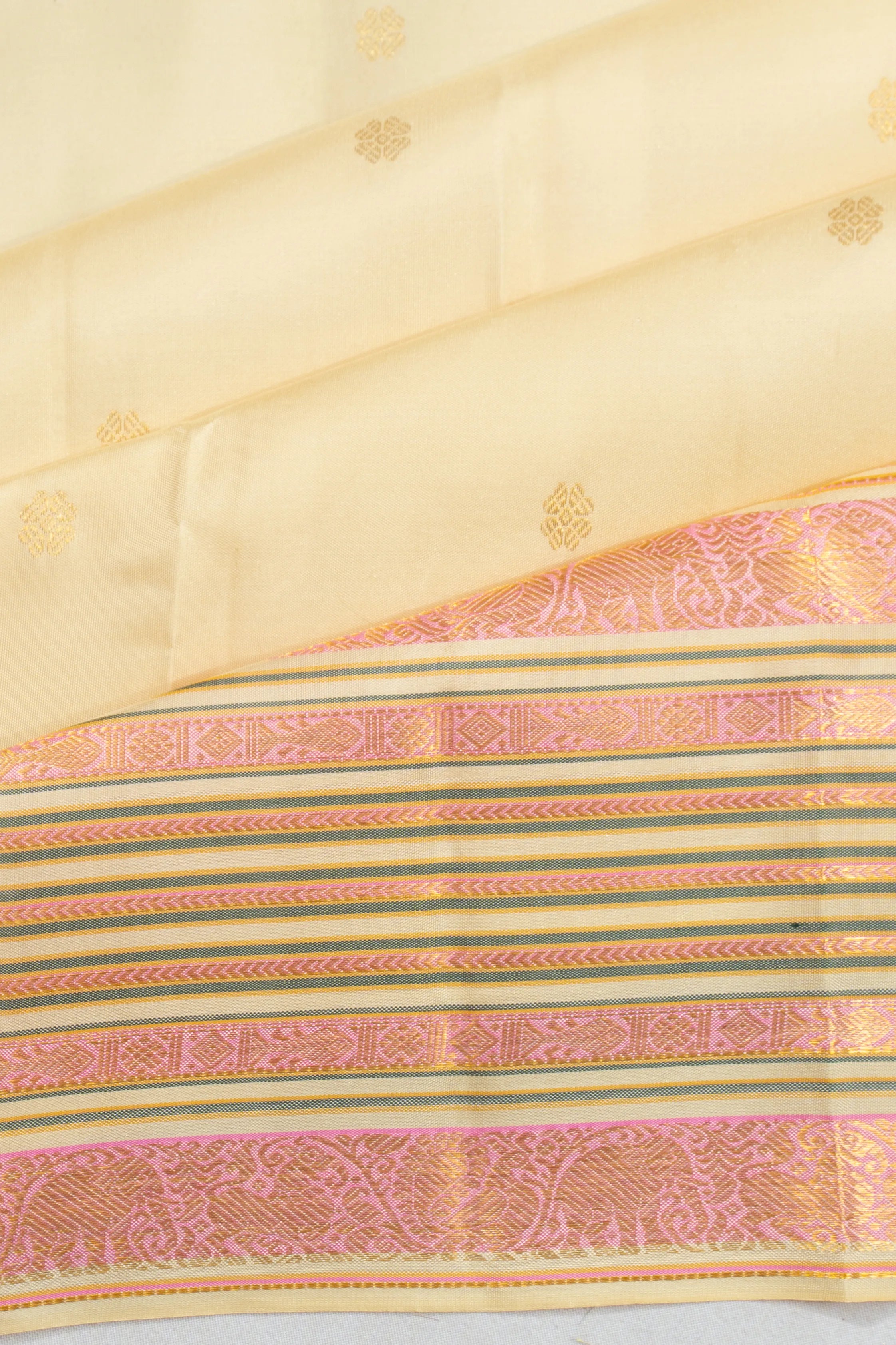 A small yet striking border features self gold zari peacock, yali, and elephant motifs interwoven with floral vines, embodying the essence of classic elegance