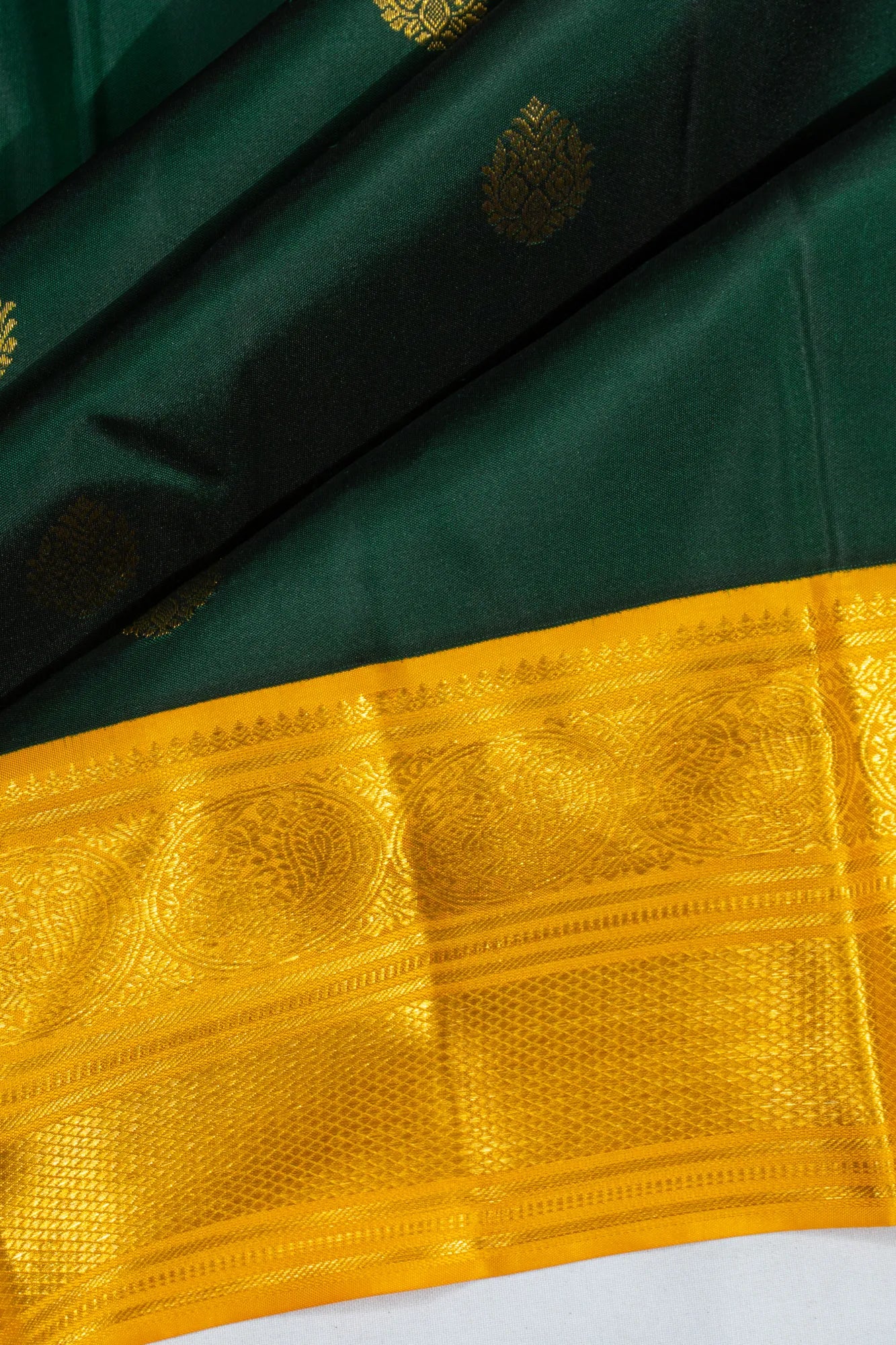 Green base adorned with elegant gold zari floral buttas lends a regal yet classic appeal.