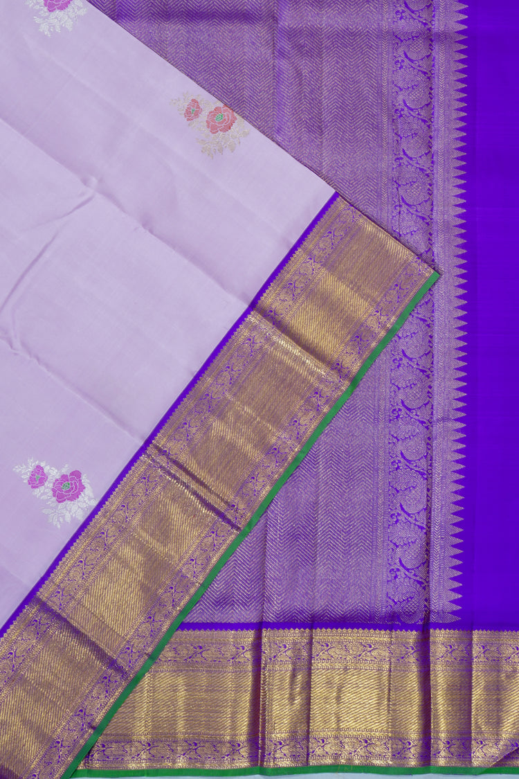 The contrast gold zari diagonal lines violet medium border features peacock motifs in florals, followed by a green edge, creating a stunning contrast.