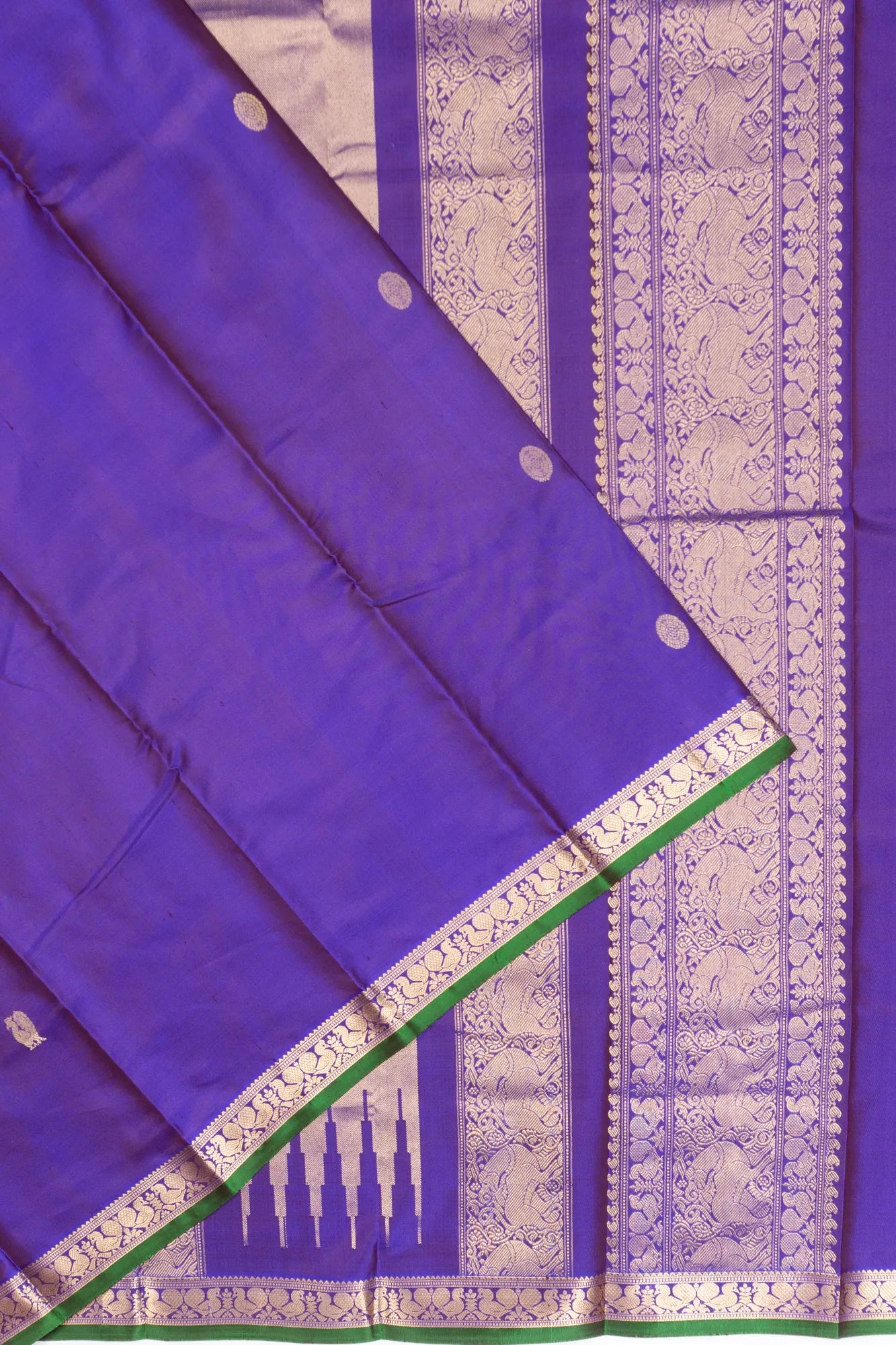 The small border showcases self gold zari peacock motifs nestled within a floral brocade, finished with a delicate green edge that adds a touch of freshness
