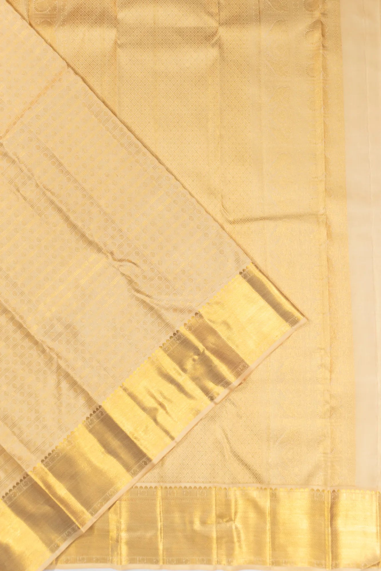 The self gold zari small border is woven with diagonal lines, adorned with peacock and paisley motifs in series, reflecting classic South Indian weaving traditions.