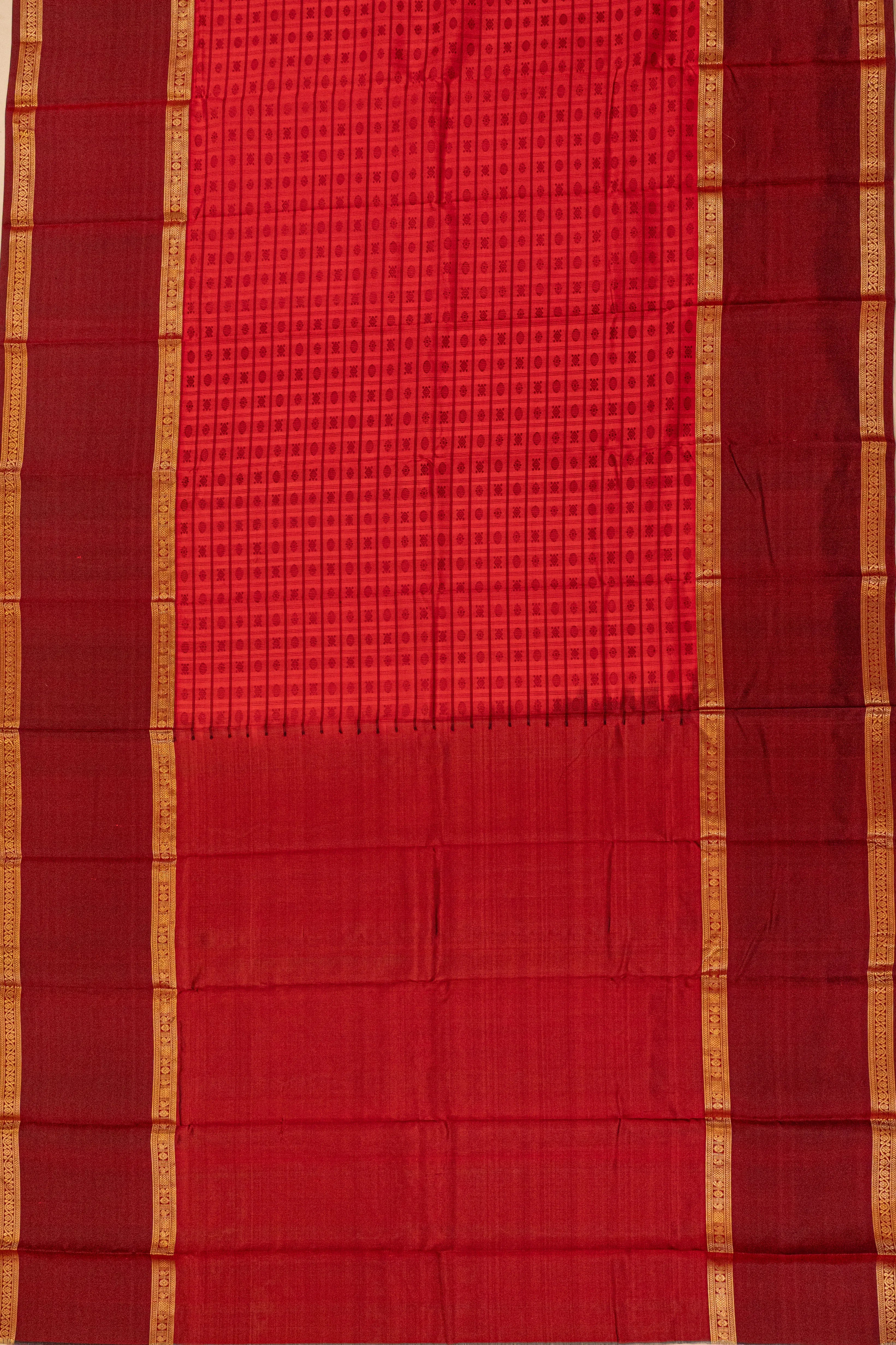 A harmonious contrast is achieved with the gold zari floral brocade rettai pattu medium border, adding an opulent touch to the saree’s vibrant red hue