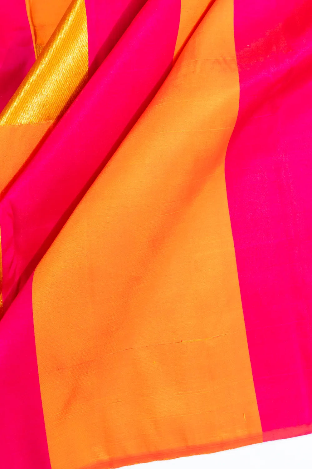 Body: A tribute to timeless design, this saree features an all-over gold zari checks pattern on a multicolour pink base. The checks form a geometric rhythm across the drape, reflecting classic South Indian aesthetics with a pop of youthful vibrance