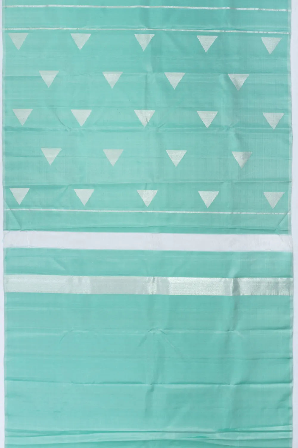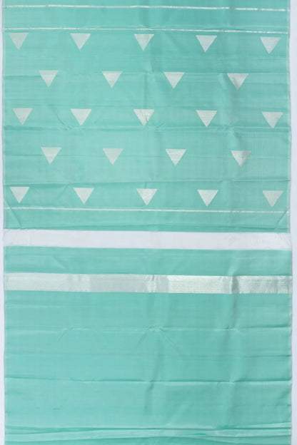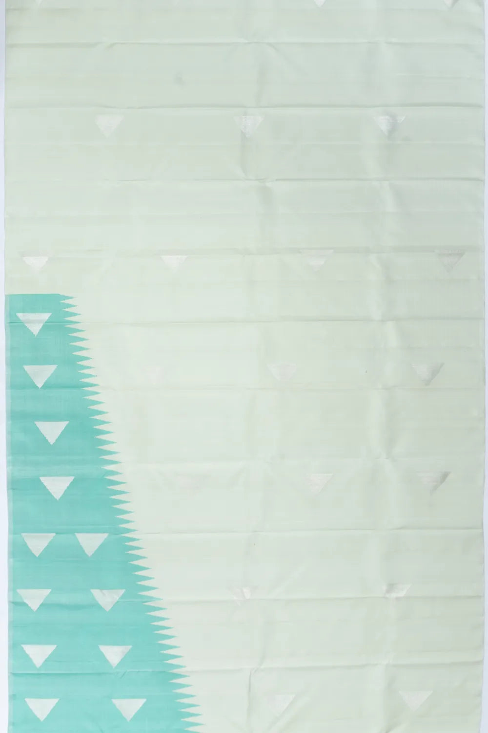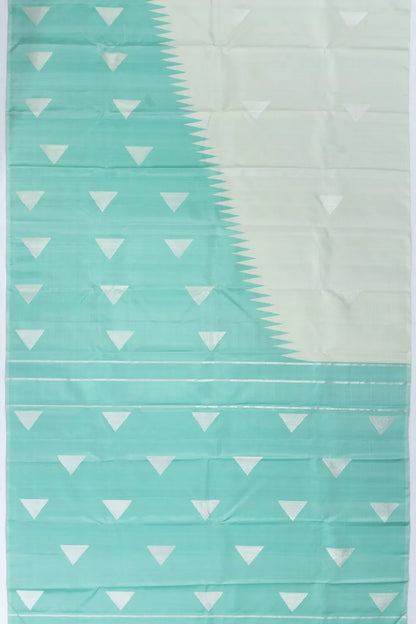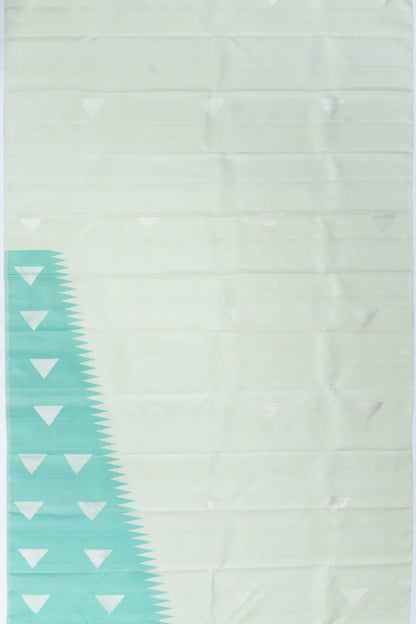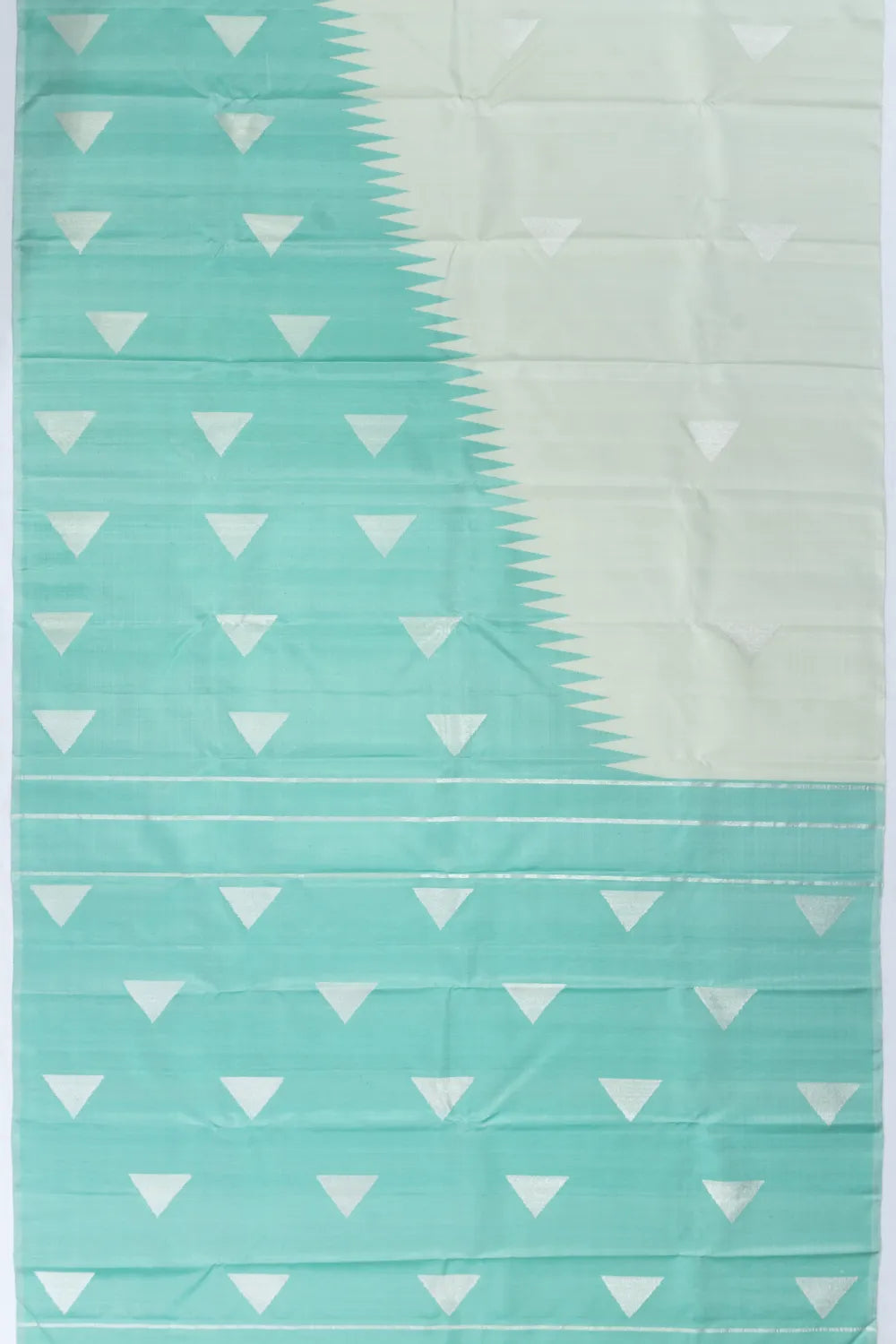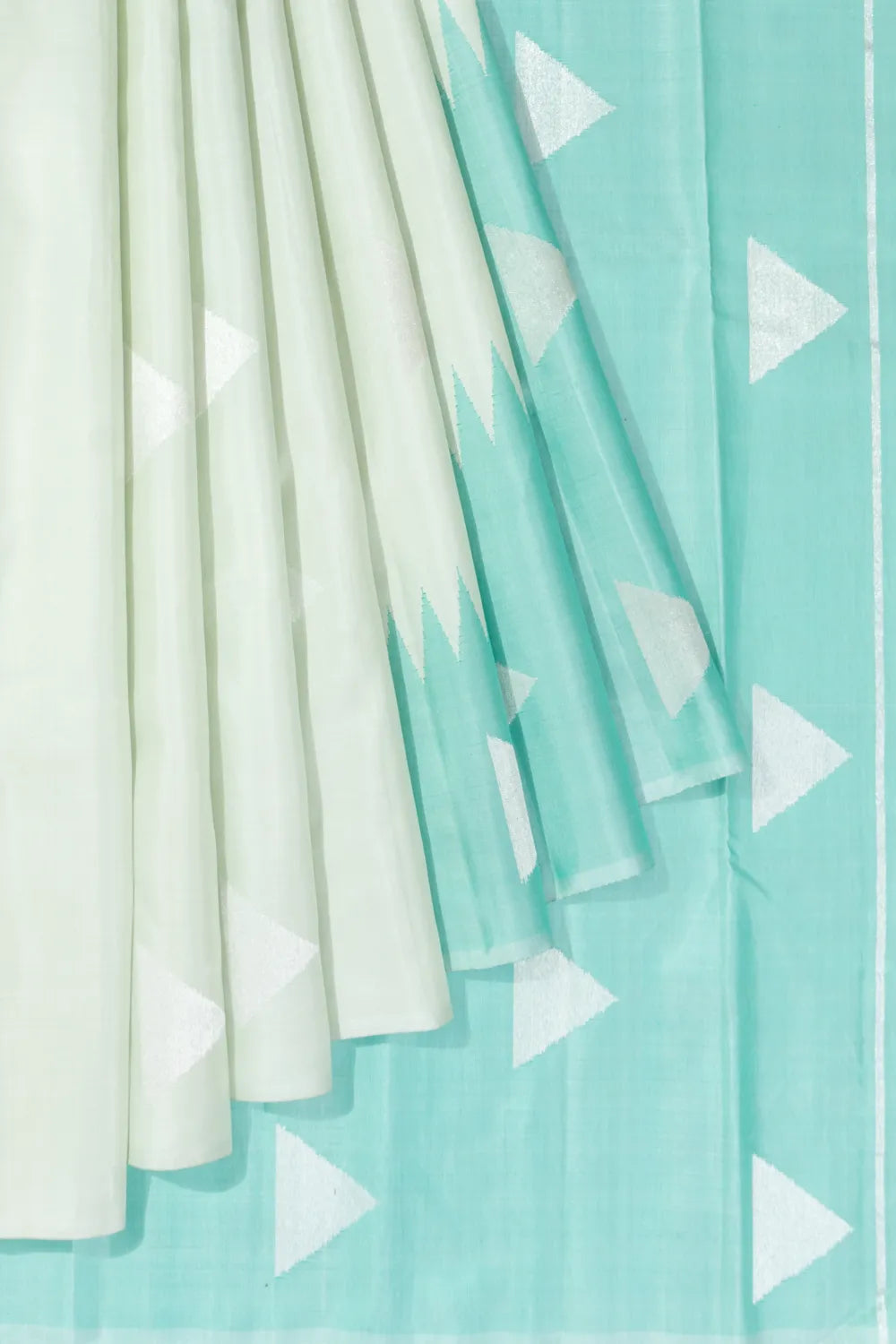 The cream half is adorned with small, silver zari inverted triangle motifs, evenly spaced for a subtle shimmer