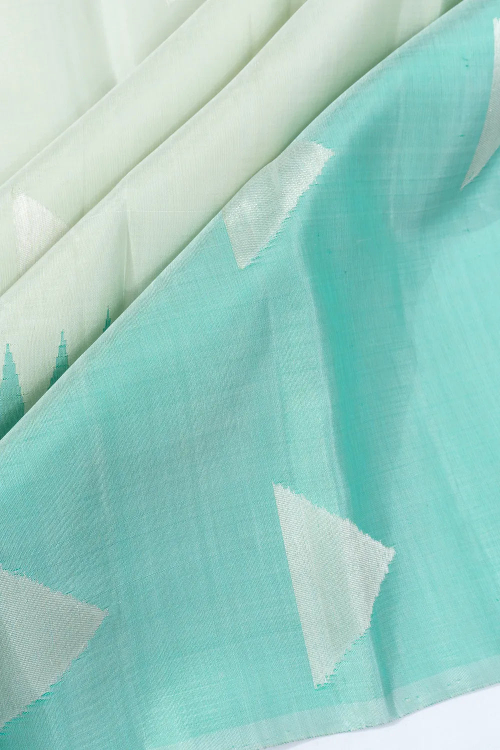A graceful fusion of minimalism and tradition, this saree features a half-and-half layout with a cream and green split.