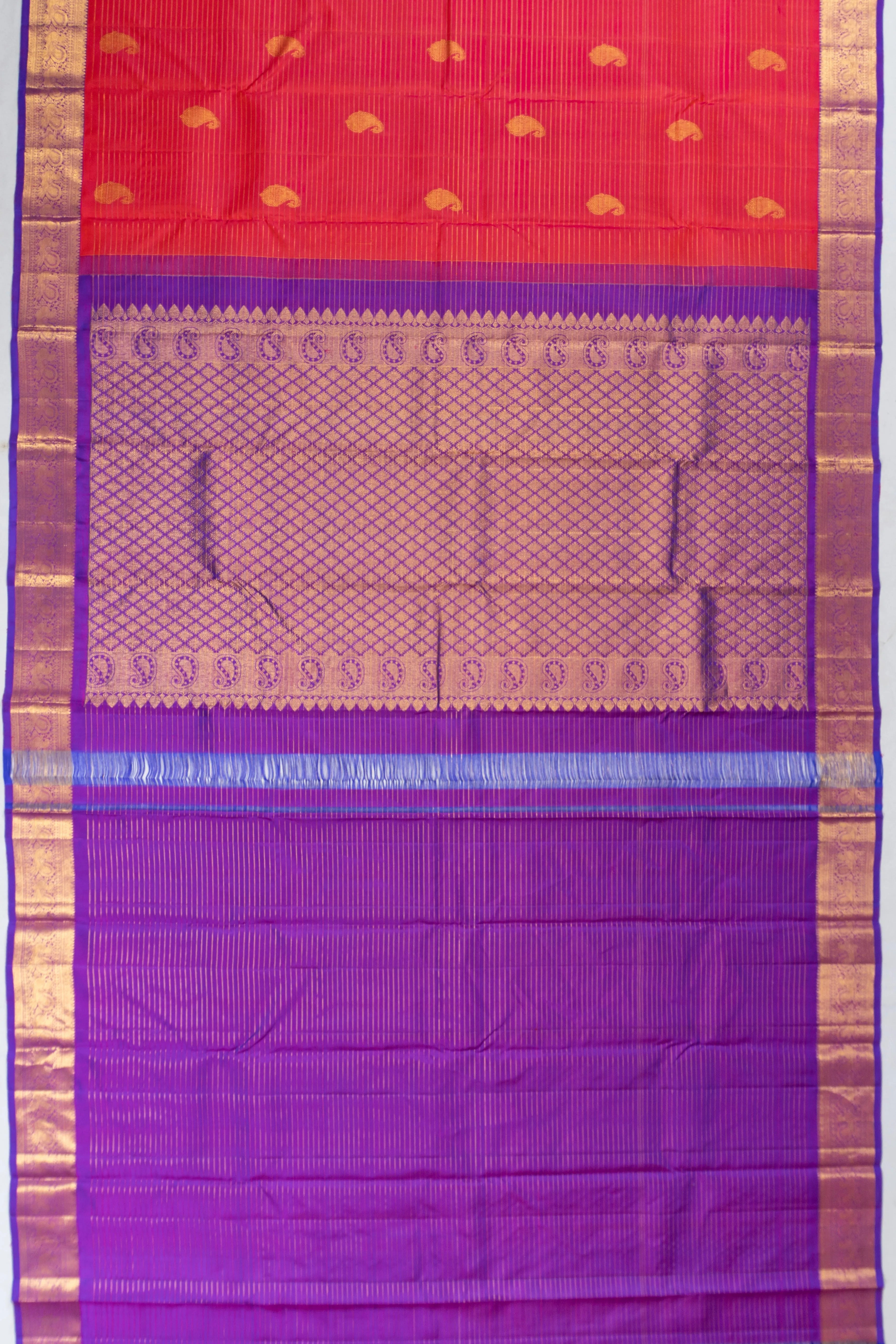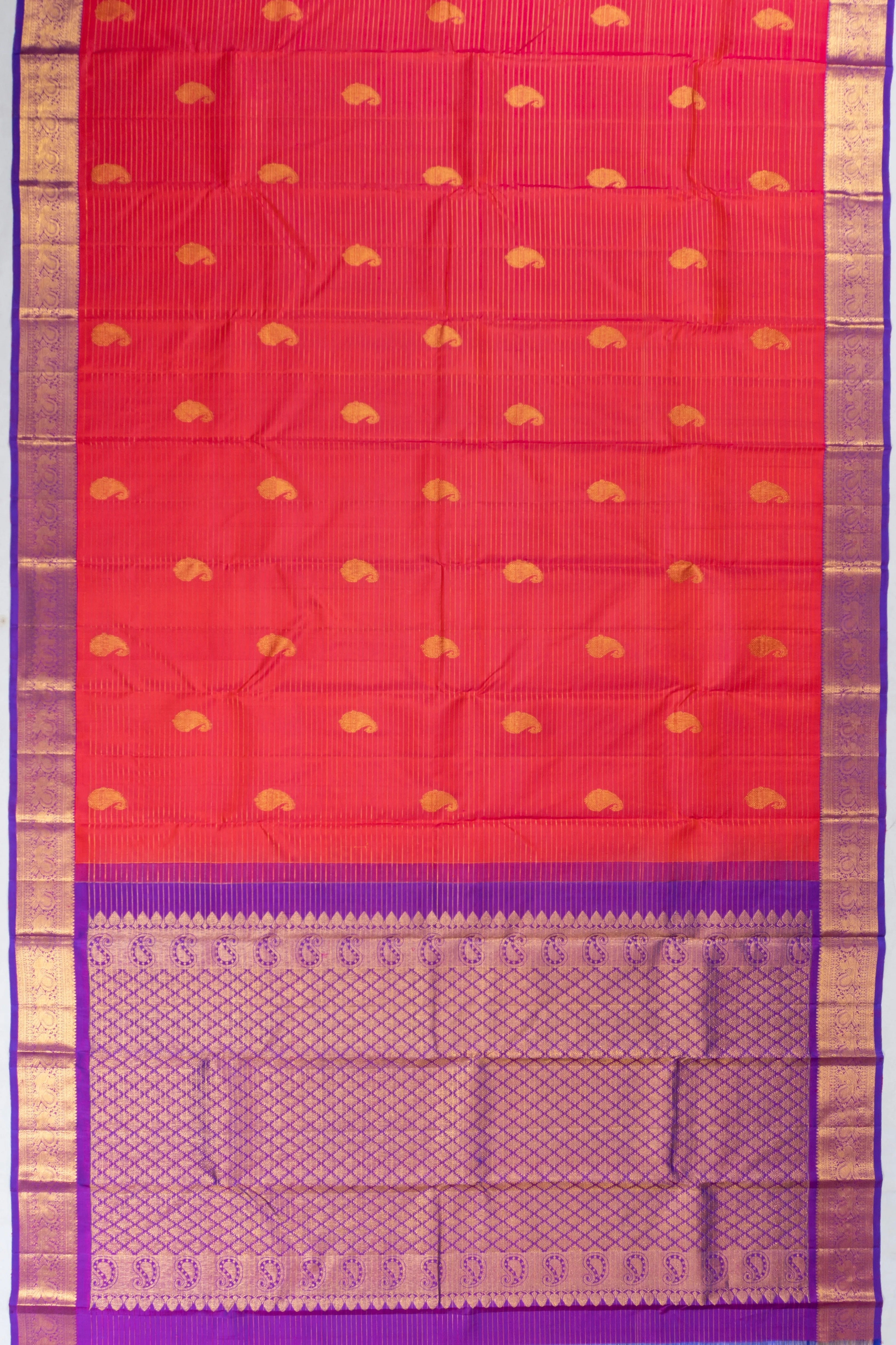 The saree's body is adorned with gold zari horizontal lines and delicate floral paisley buttas, offering a touch of timeless beauty and intricate craftsmanship
