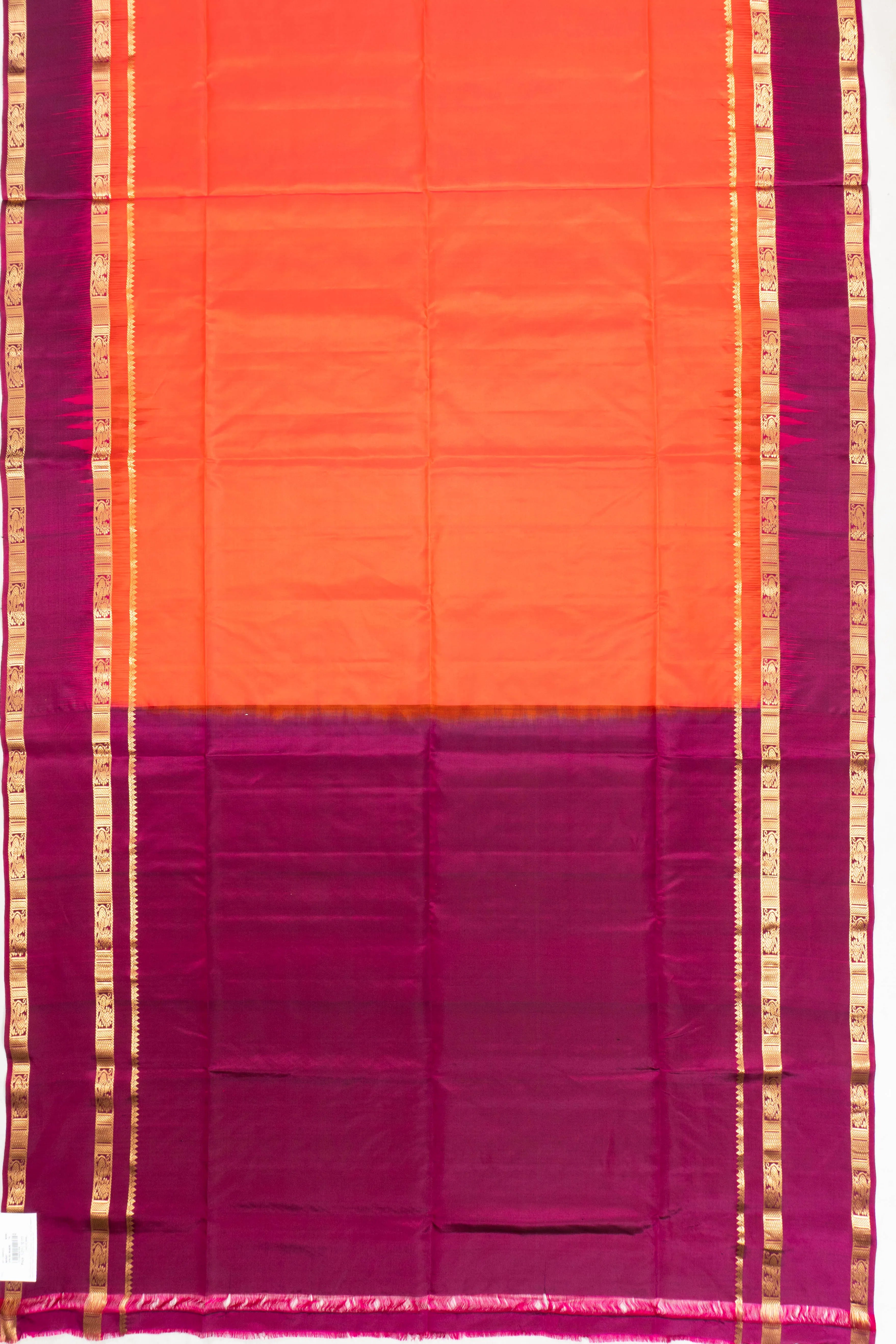 This saree features a striking contrast with its small purple border, intricately designed with gold zari brocade and elegant peacock motifs
