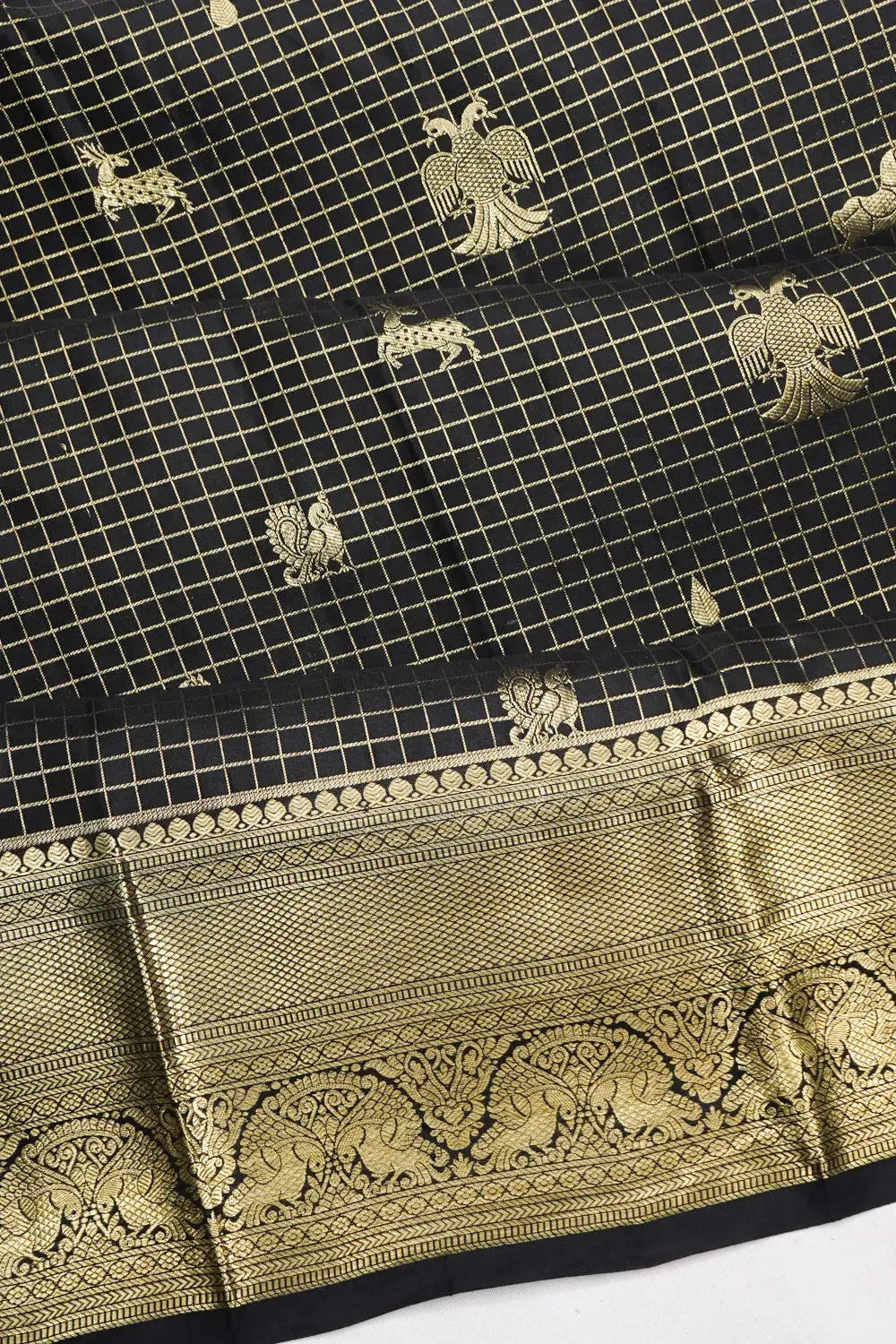 The saree's body is adorned with gold zari checks, interspersed with intricate animal, bird, and floral motifs, creating a harmonious blend of nature-inspired artistry