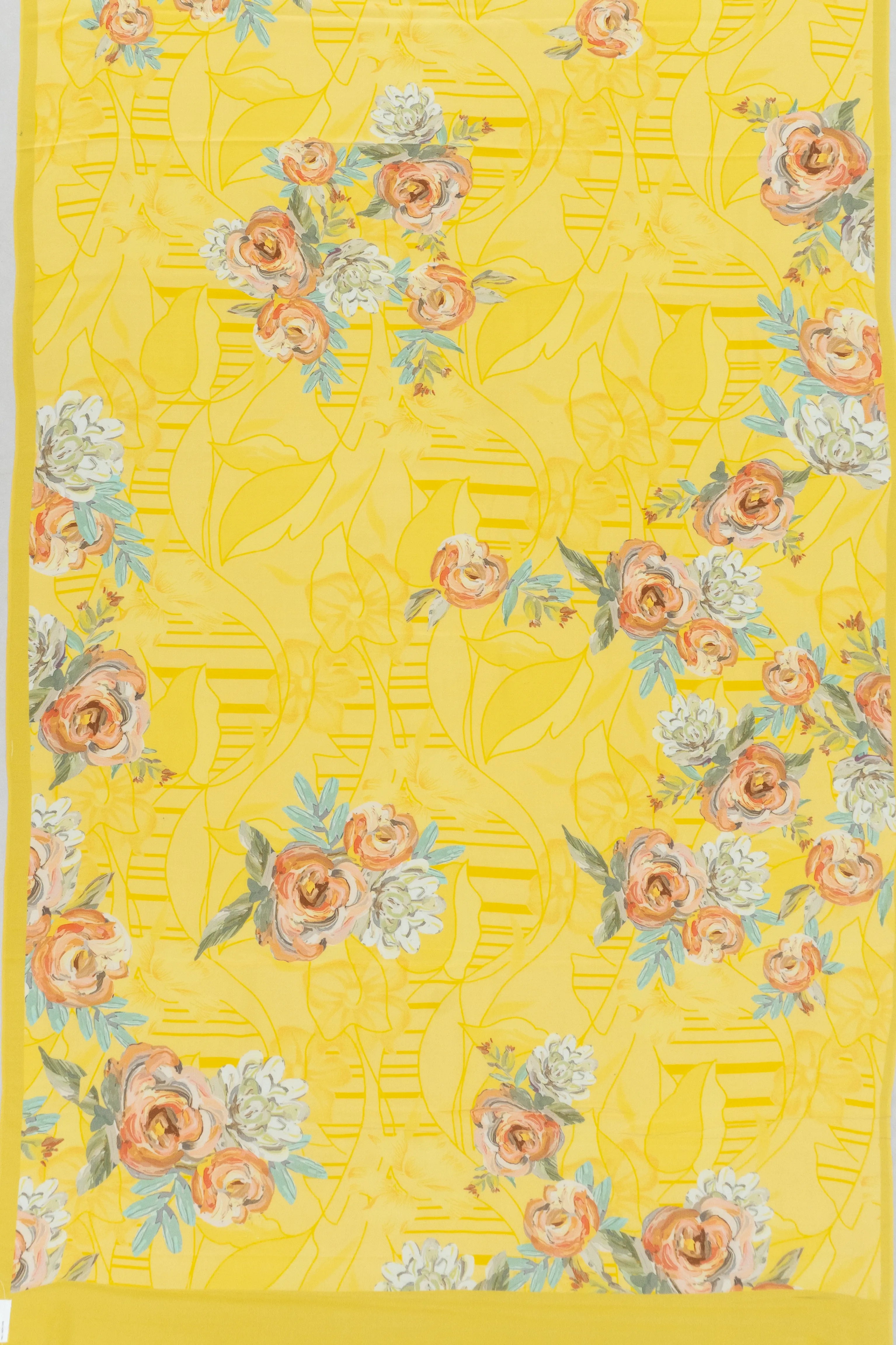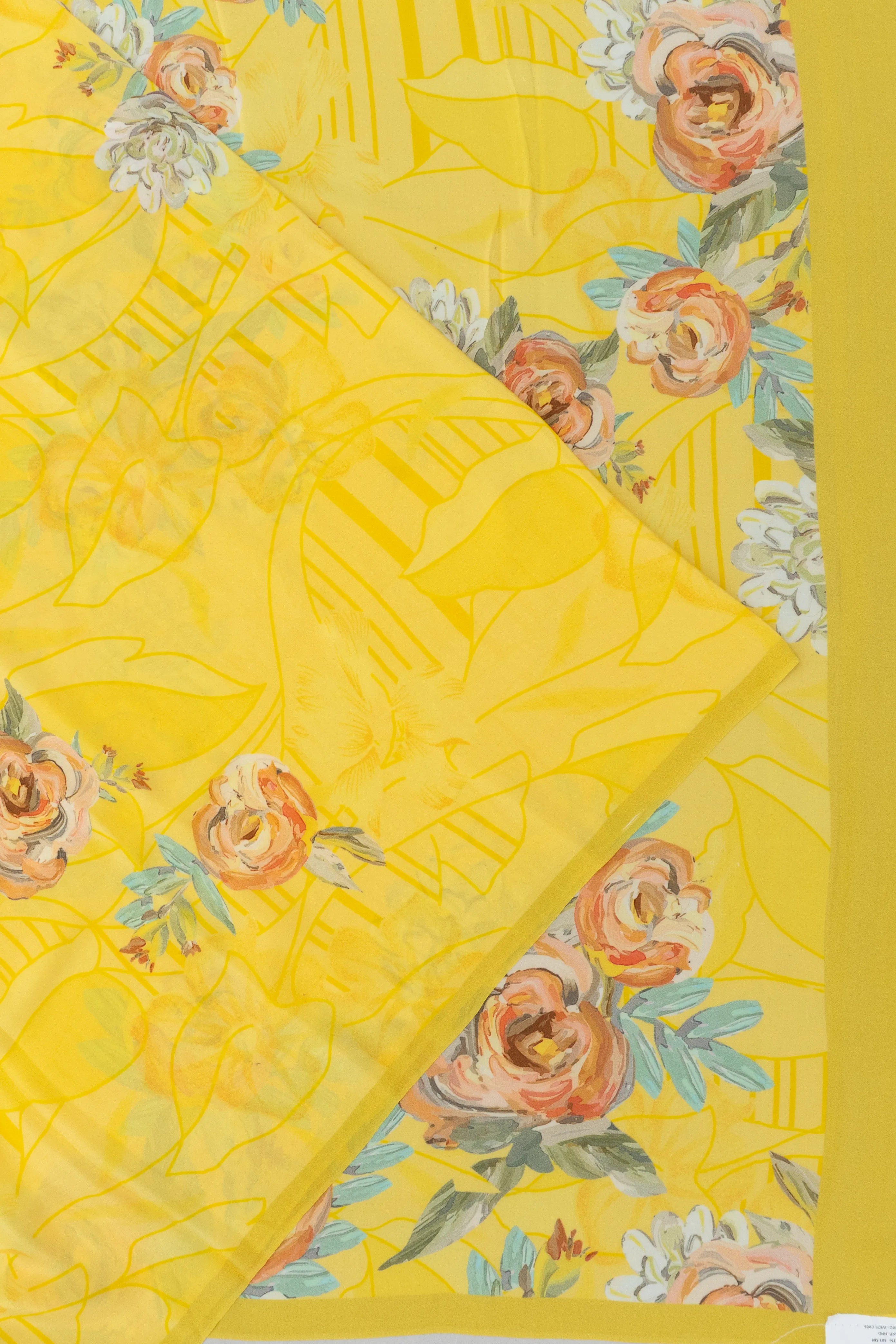 The saree's body is adorned with delicate floral prints that offer a timeless charm, capturing the essence of classic Indian textiles in every fold