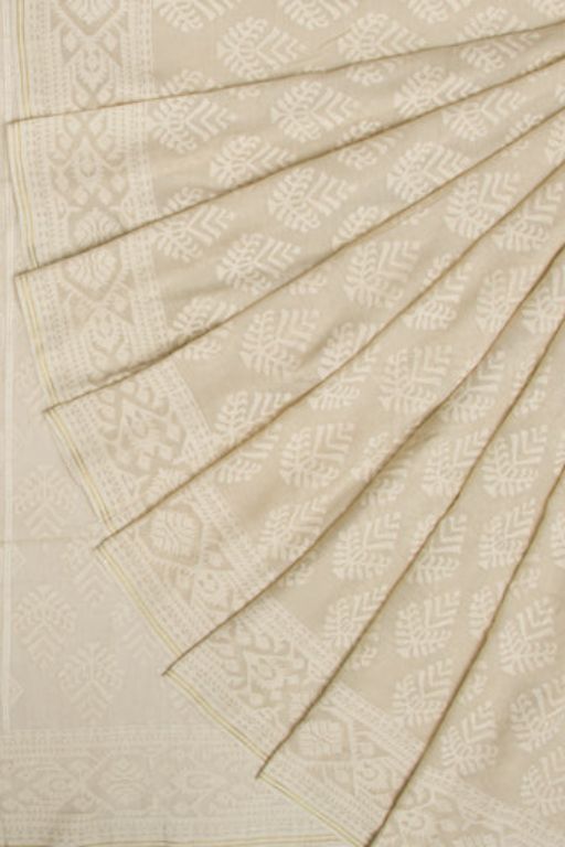 An Off White base embellished with a white thread tree inspired butta with each petel is woven seperately The saree is enveloped into a small jamdani border self-woven perfectly matched with a self pallu is an elegant and unique addition to your wardrobe The saree comes with a self-plain blouse Handwoven from an exceptional cotton variety, Muslin fabrics are truly special Their threads are soft and resilient at the same time The process of creating each of these masterpieces requires 8 months of meticulous effort A true treasure!