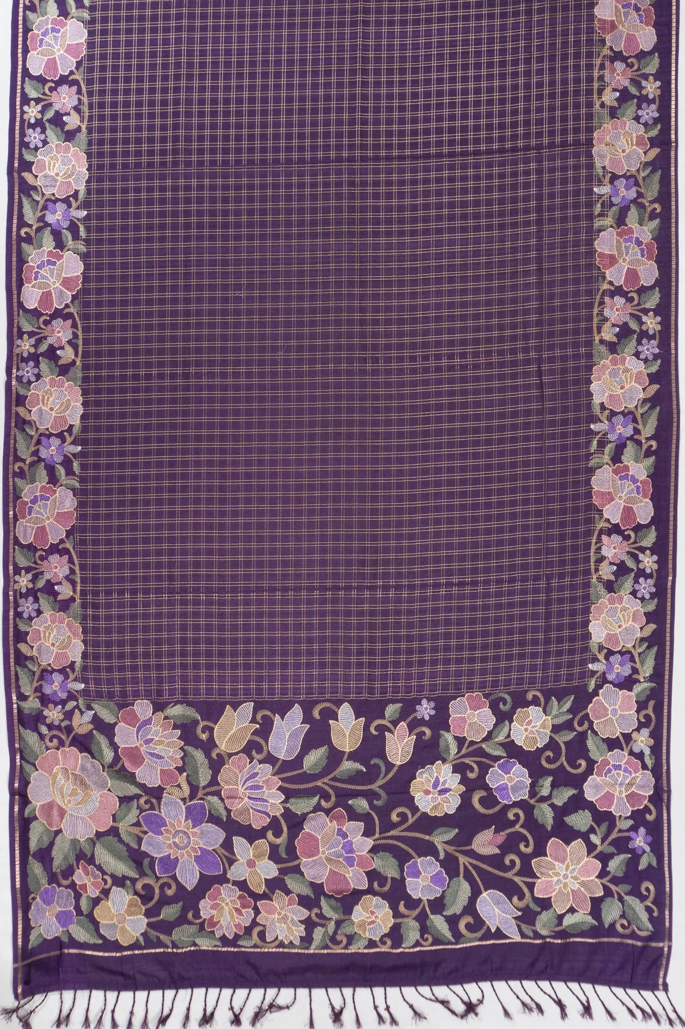 The self-embroidery floral vines along the border add an exquisite flair, while the pallu showcases a harmonious floral embroidery, complete with graceful tassels that lend a playful finish