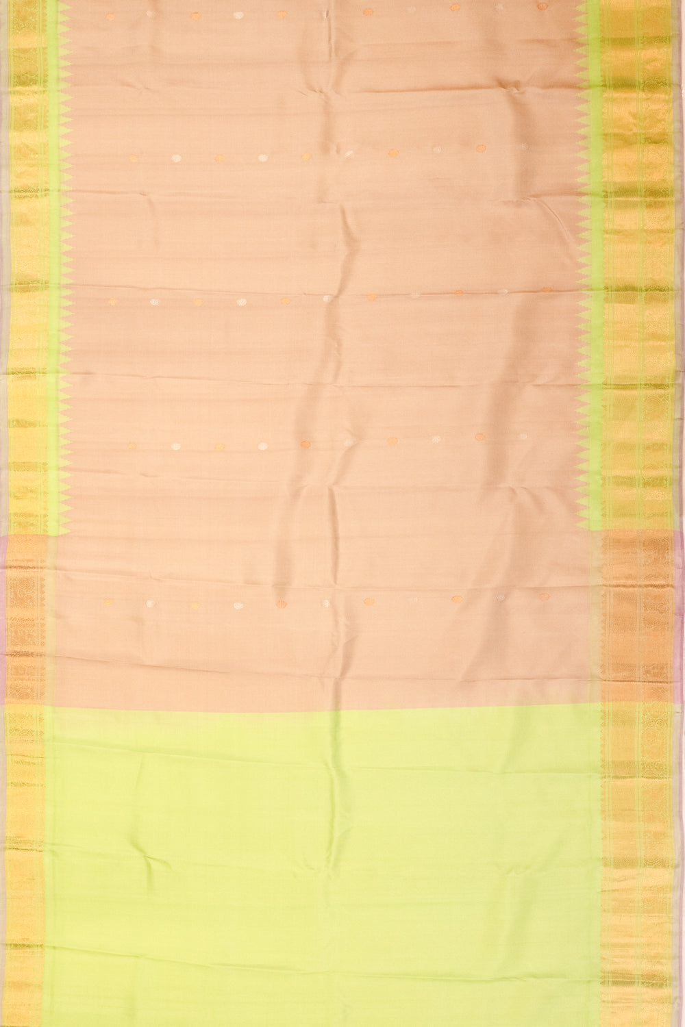 Its contrasting border features gold zari zigzag lines, accented by small temple motifs in green, and is enriched with exquisite peacock designs nestled in floral vines
