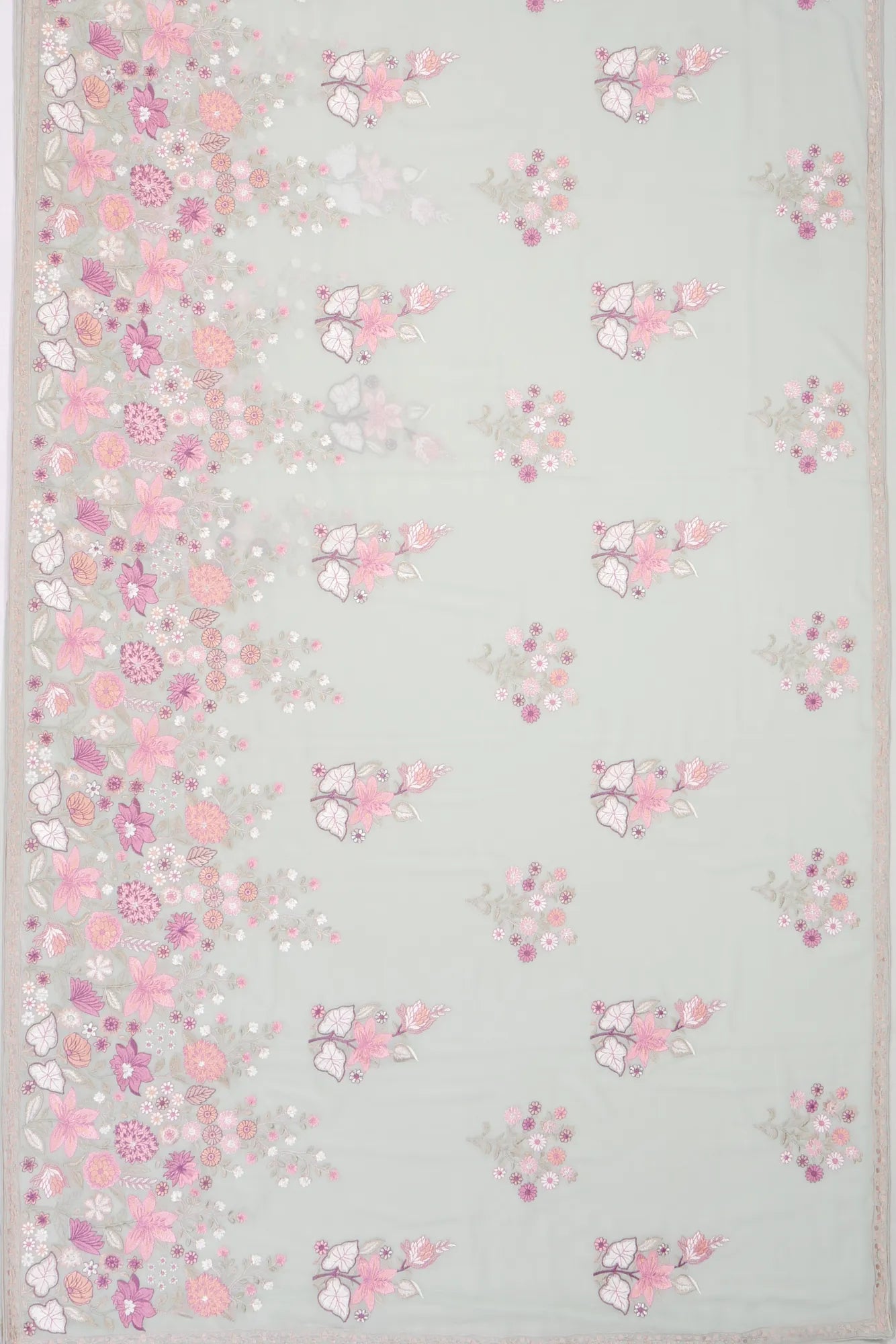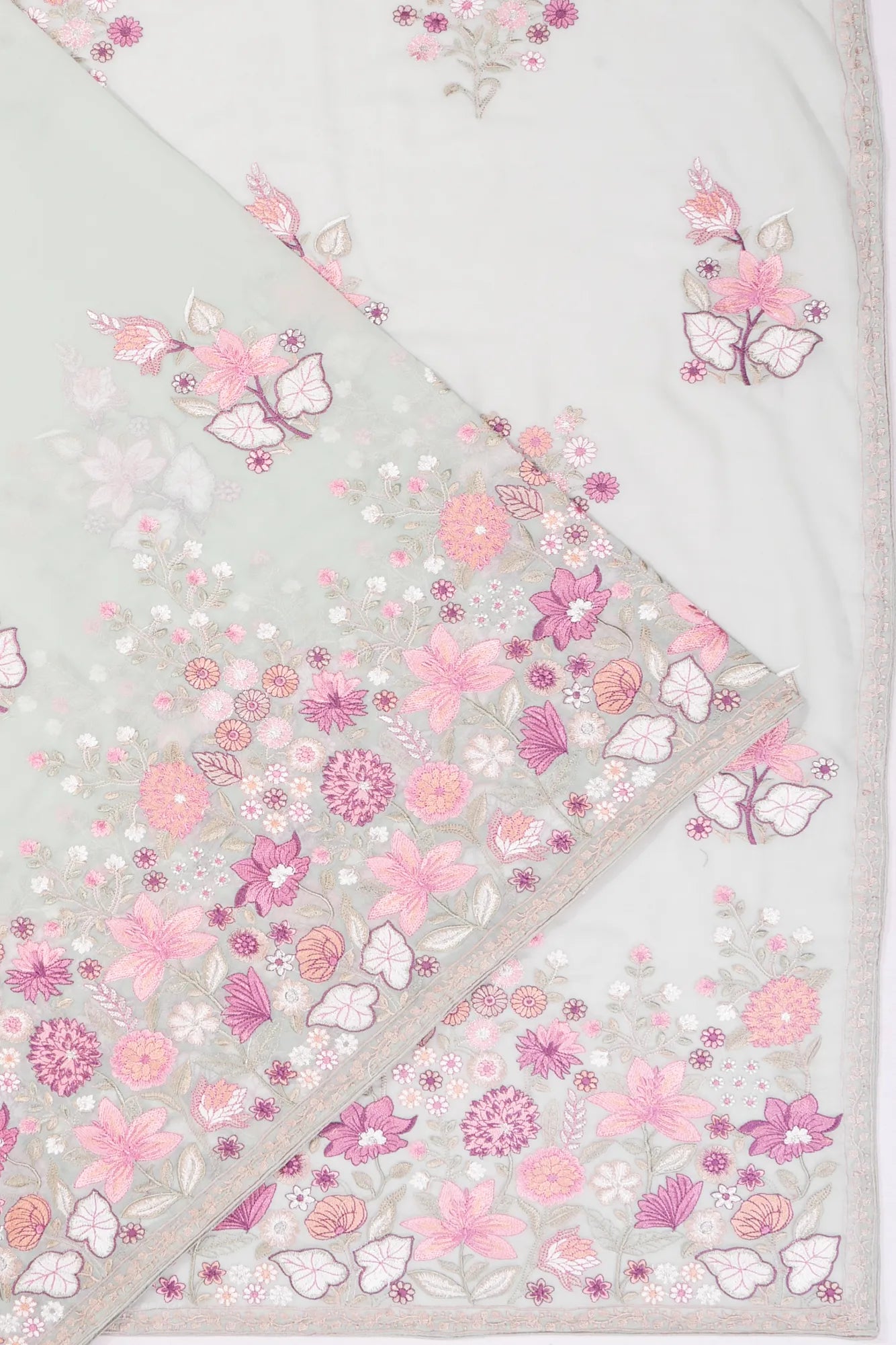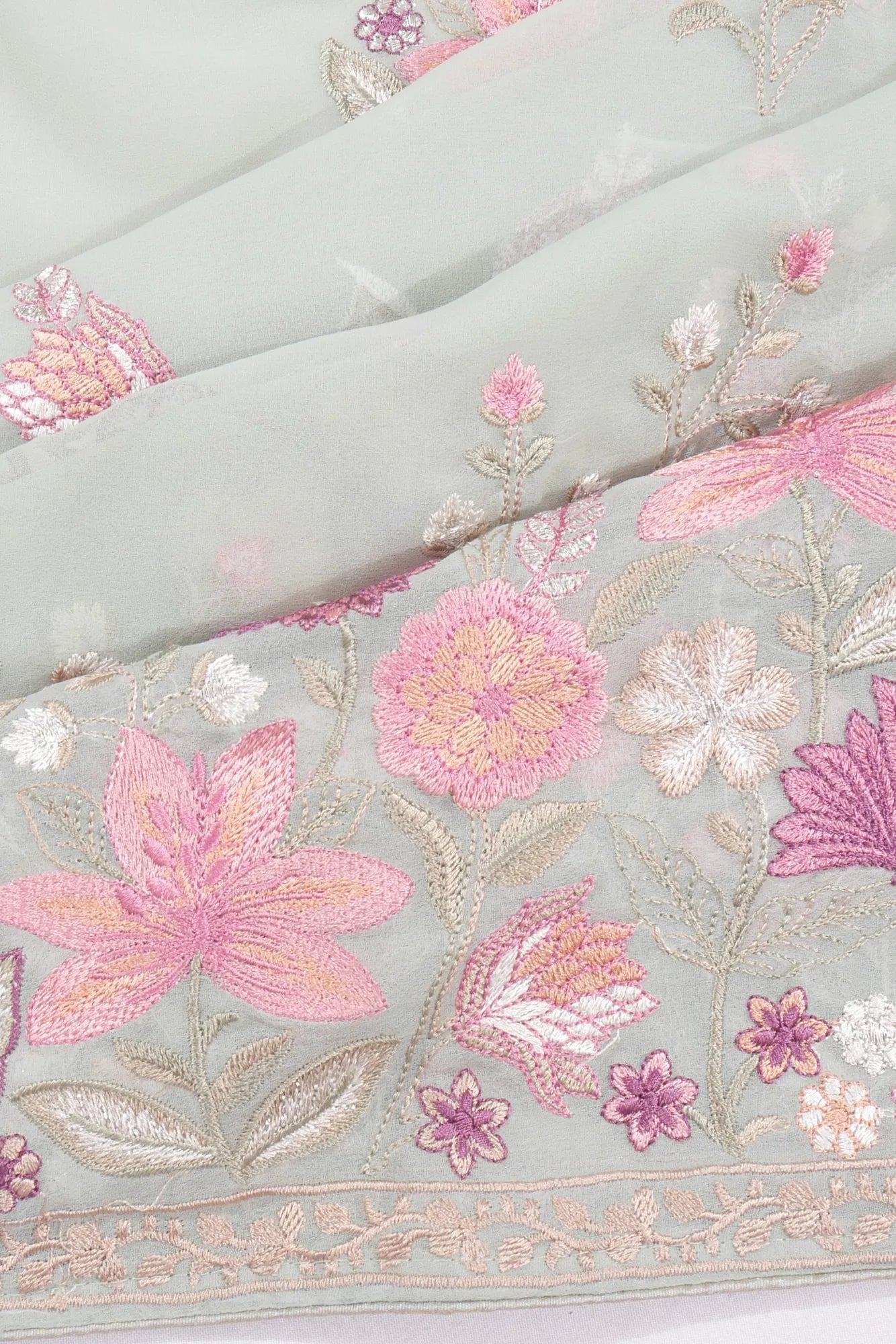 The saree is gracefully adorned with floral embroidery buttas that add a touch of elegance and timeless beauty to the soft pastel grey backdrop