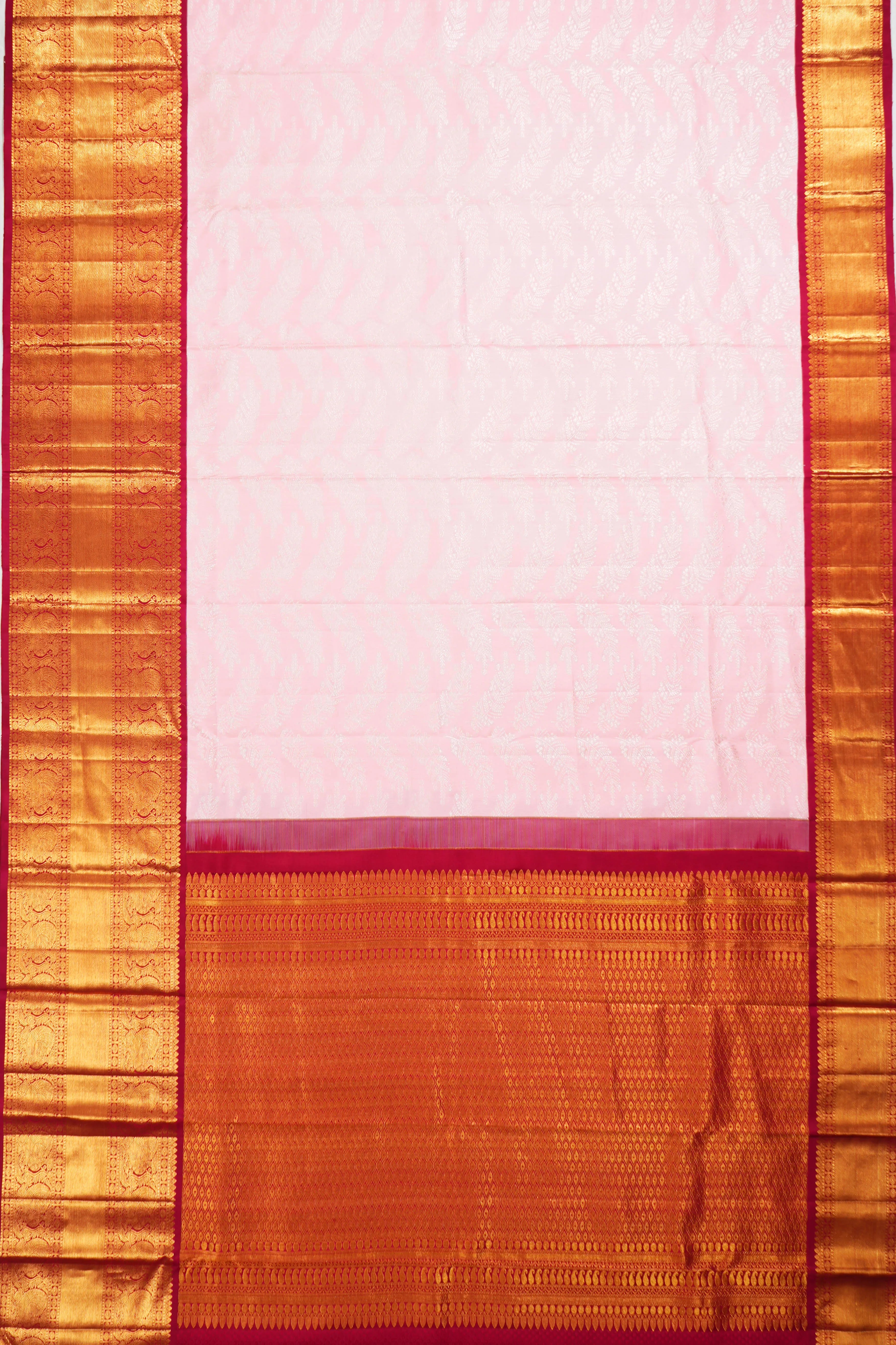 The saree features a soft baby pink base adorned with silver zari floral brocade, creating a sophisticated and elegant look.