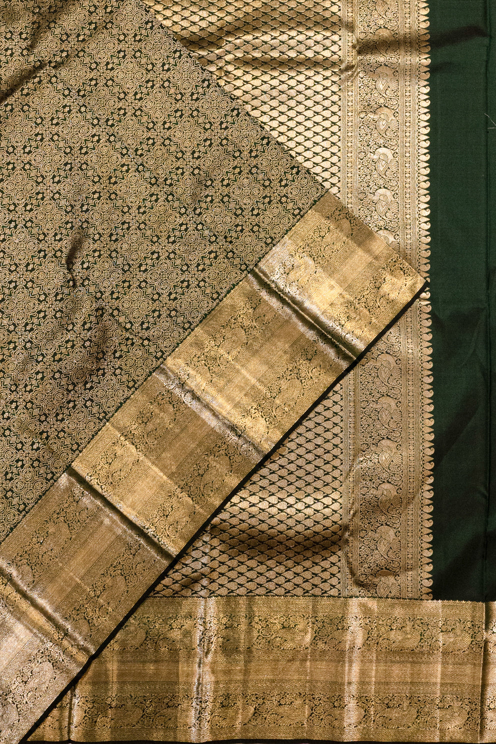 The saree's body is adorned with gold zari floral brocade, exuding a refined elegance that captivates the eye