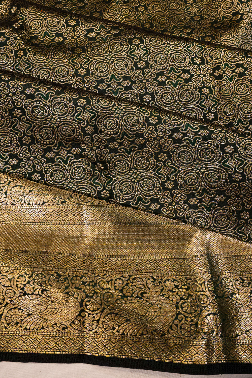 The medium border, showcasing self gold zari diagonal lines, is embellished with exquisite peacock motifs nestled within a floral brocade