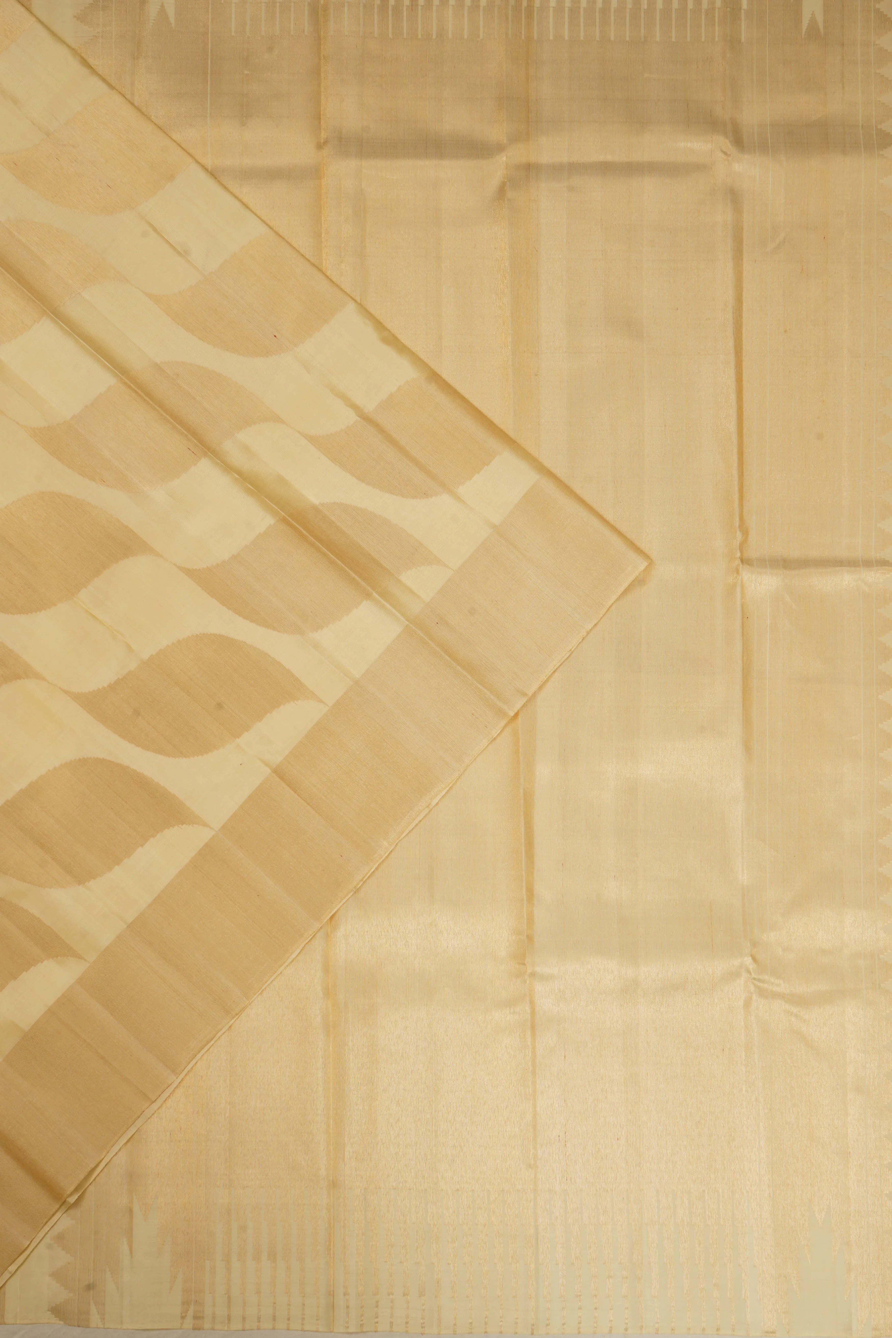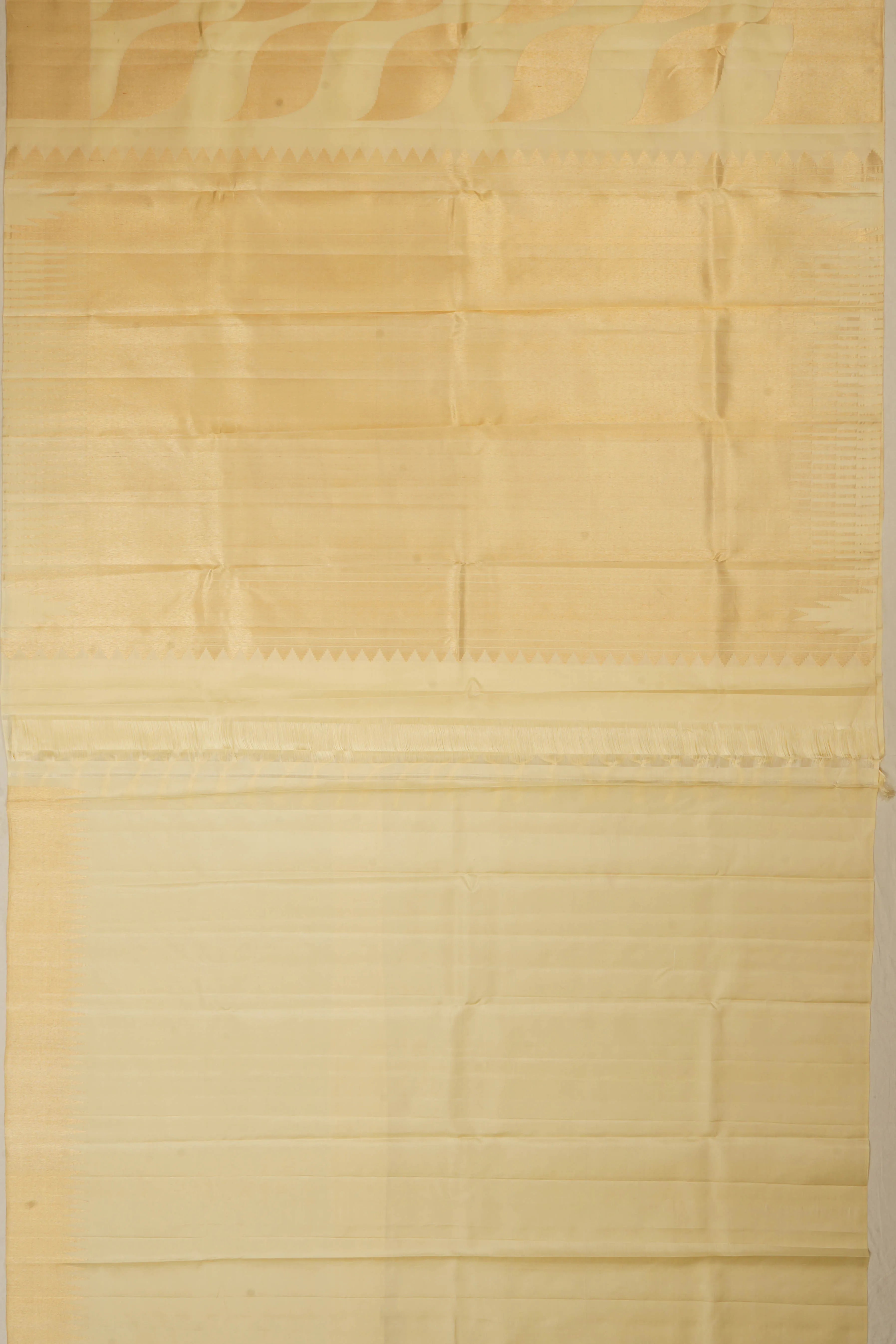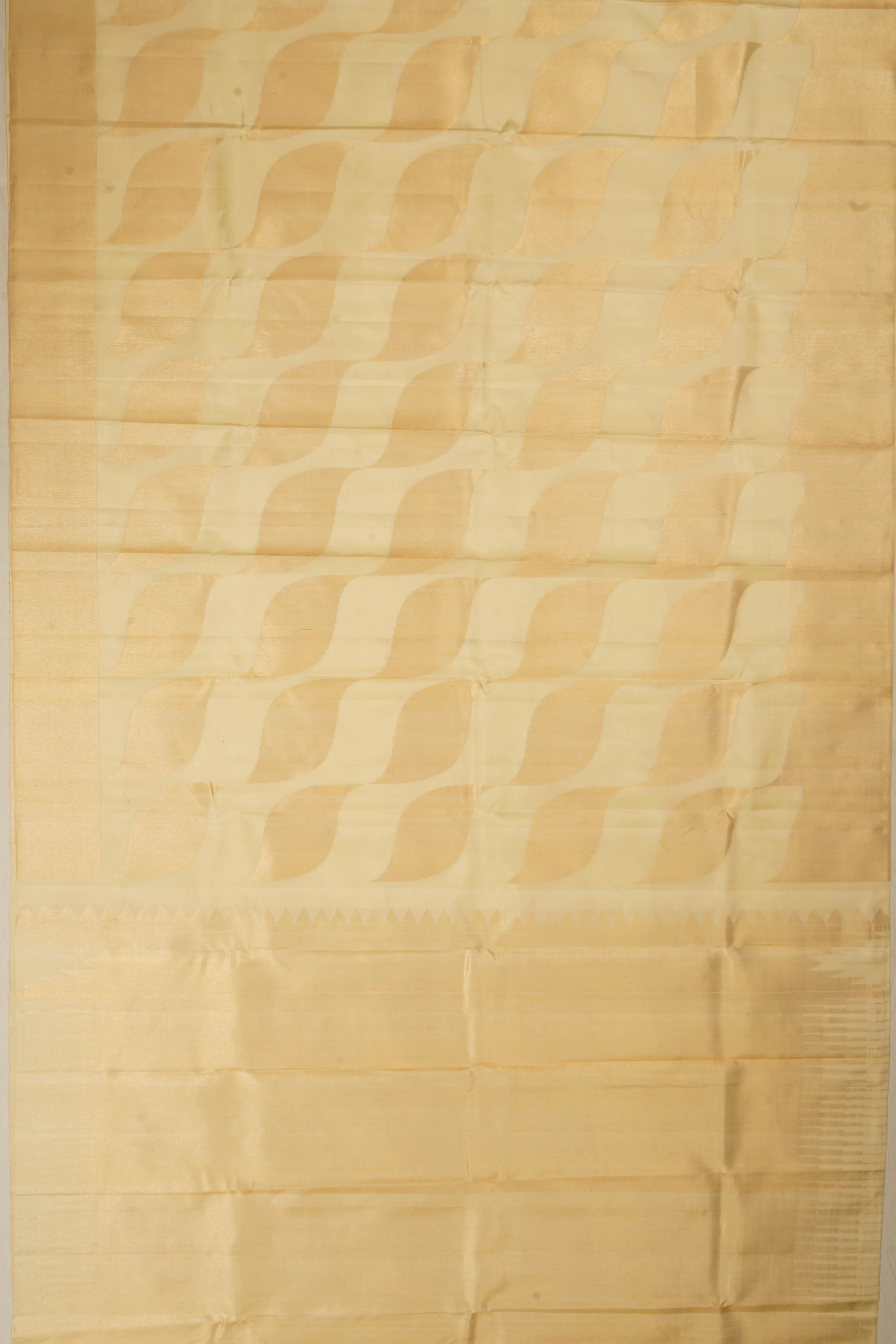 This elegant saree features a gold zari geometrical brocade across a luxurious cream silk base, offering a subtle yet sophisticated texture that reflects timeless artistry.