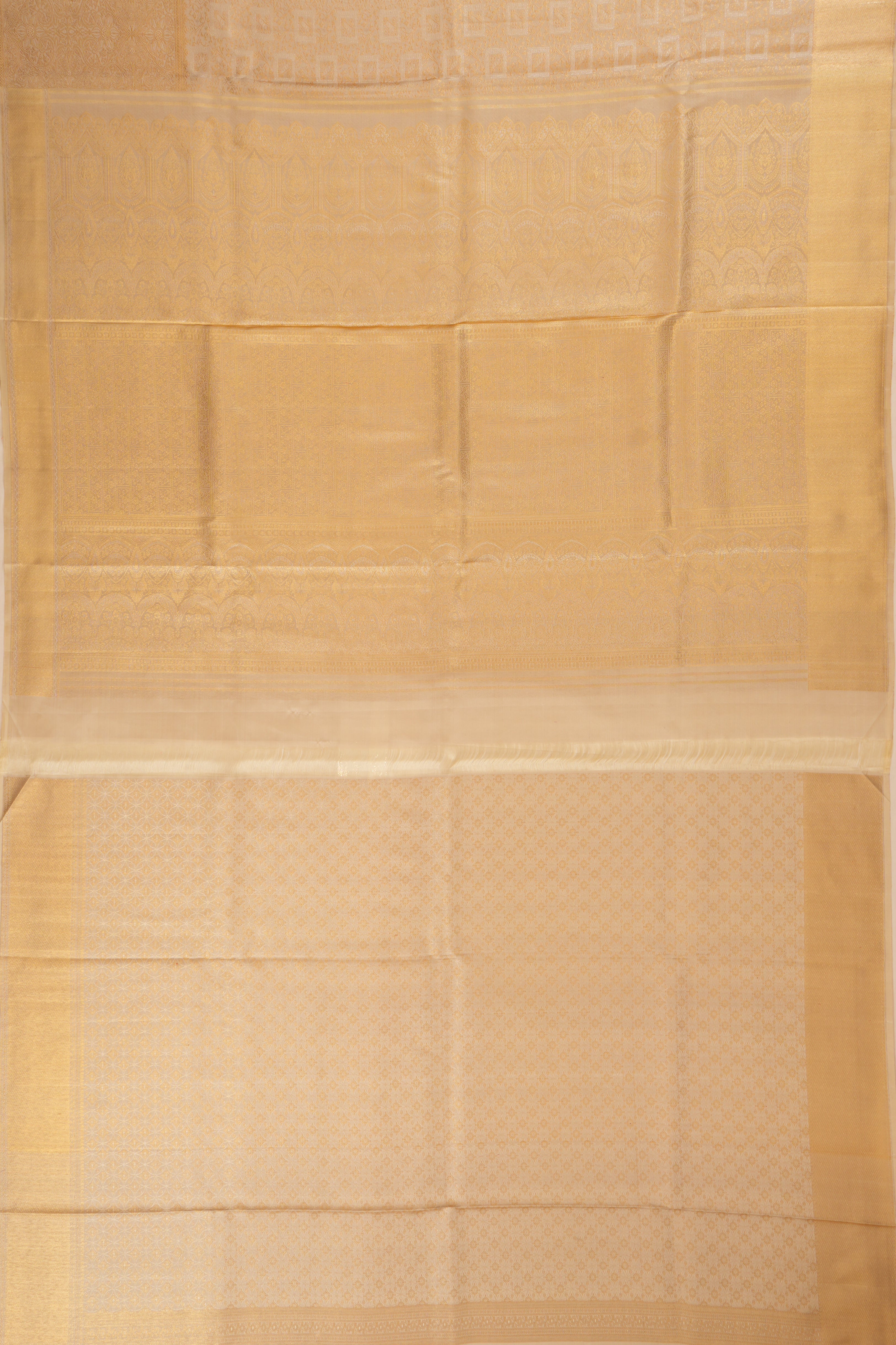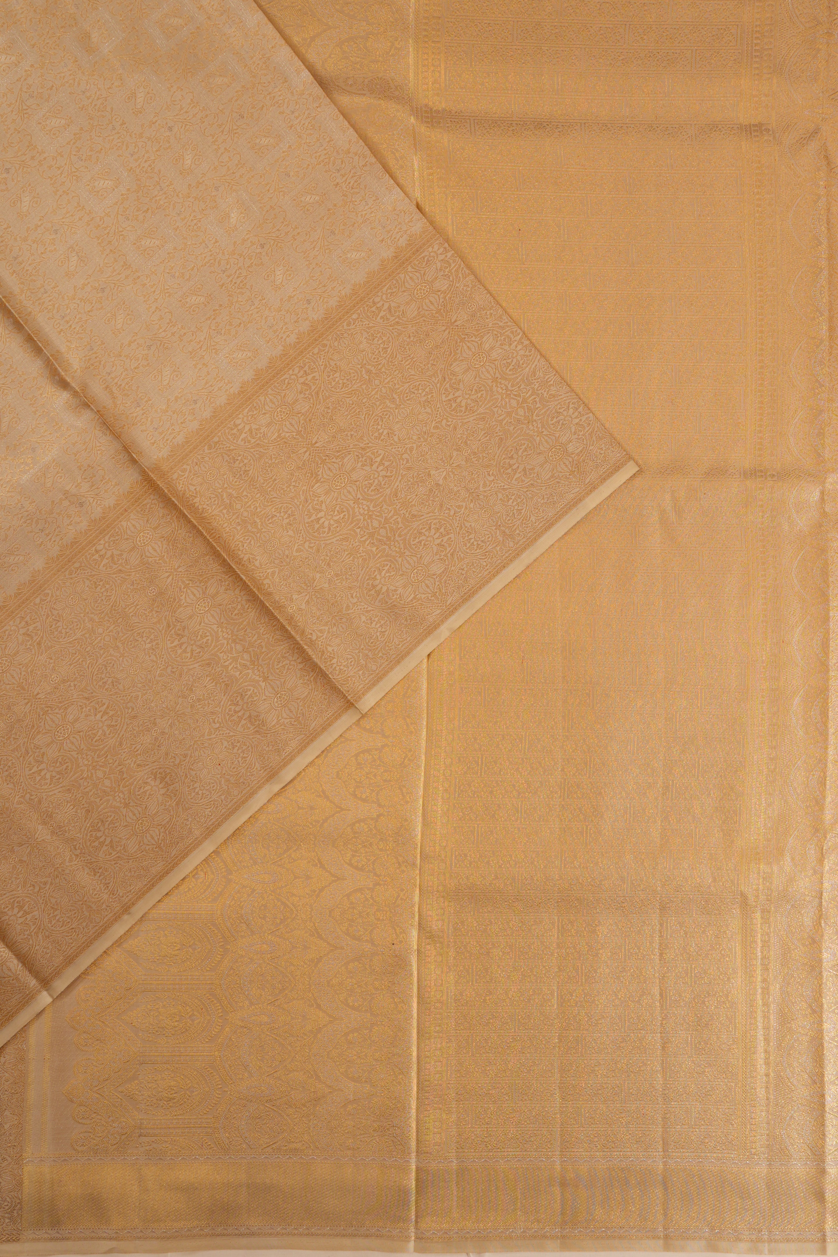 This refined cream drape features gold zari floral vines brocade accentuated with silver zari checks, creating a luminous tapestry of contrast and texture.