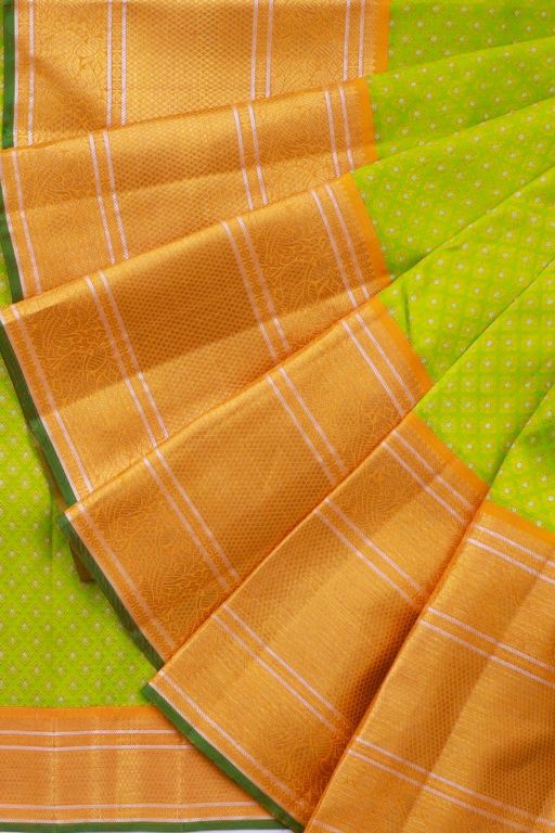 The magnificent Kanchipuram Silk Brocade Green Saree is woven to present a gorgeous bridal splendor for your couture The rich green base is toppled with gold-silver zari brocade cuddled into contrast mustard yellow korvai borderfeaturing gold zari peacocks in floral at odds with cross-checks band highlighted with silver zari lines also flanked with green selvedge is oozing perfect tradition The contrasting mustard yellow pallu with brocade and peacocks in floral vines exudes marvelous appeal with the contrast plain blouse