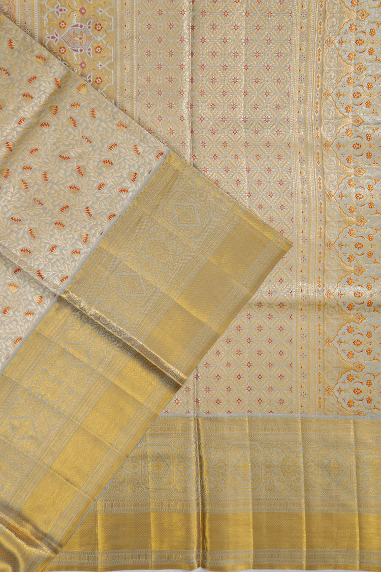 The body of this saree features a luxurious gold zari floral brocade with orange meenakari detailing on a sophisticated grey silk base, creating a striking and elegant design.