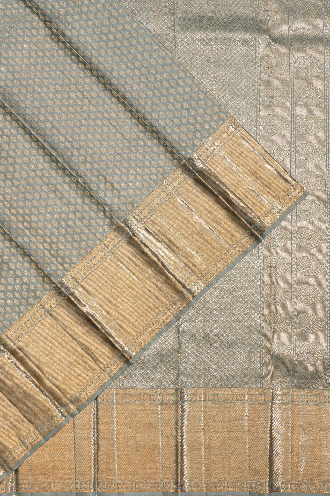 The pallu is beautifully crafted with self silver zari brocade, featuring peacock motifs nestled in florals, adding a touch of regality