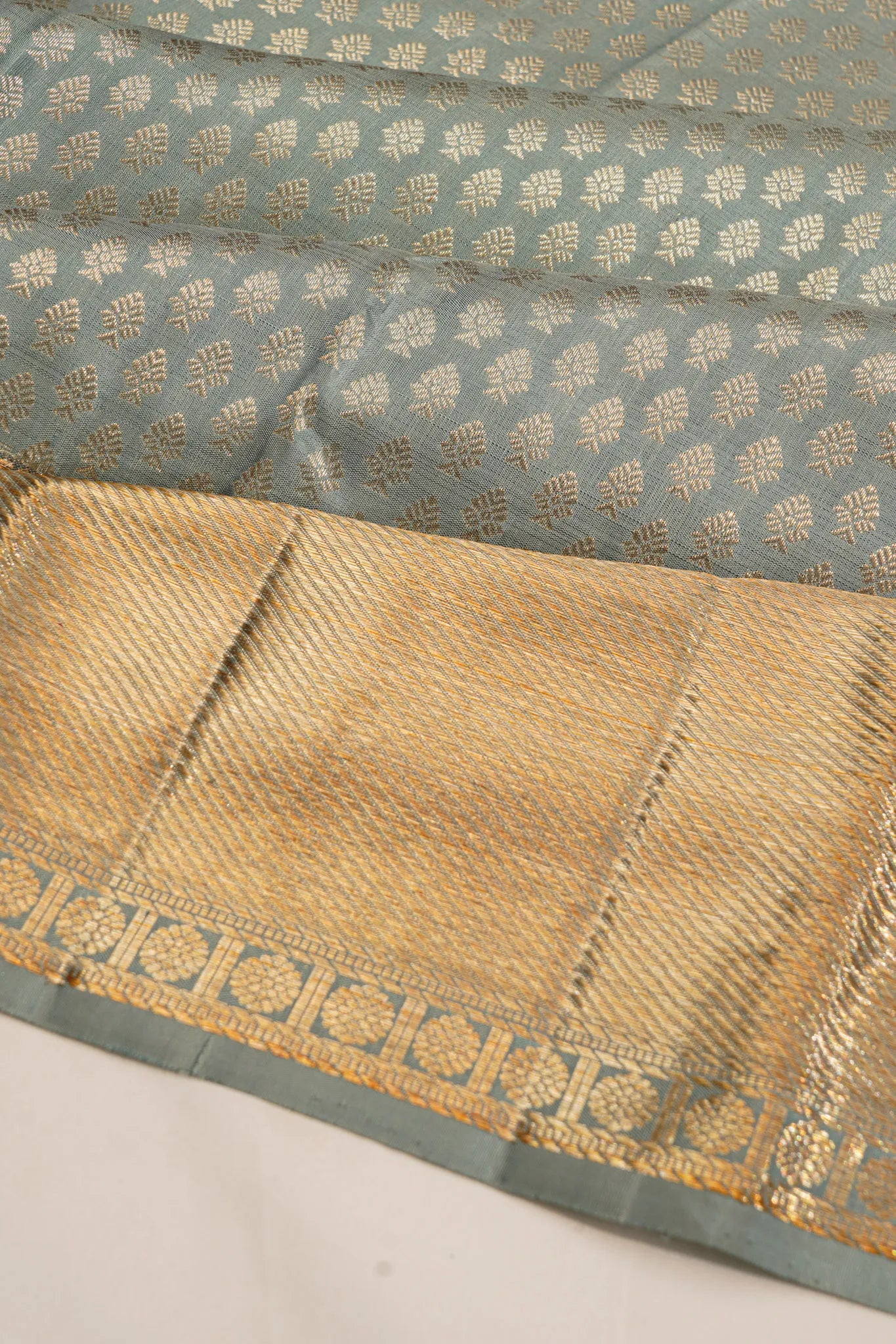 A medium border of self gold zari diagonal lines, interspersed with floral motifs, adds an intricate touch, creating a harmonious flow into the saree's design