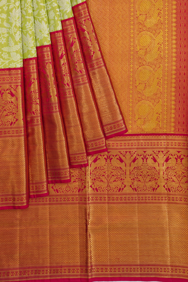Rich pastel green fabric showcasing gold and silver zari floral brocade with exquisite bird motifs, delivering a luxurious feel.